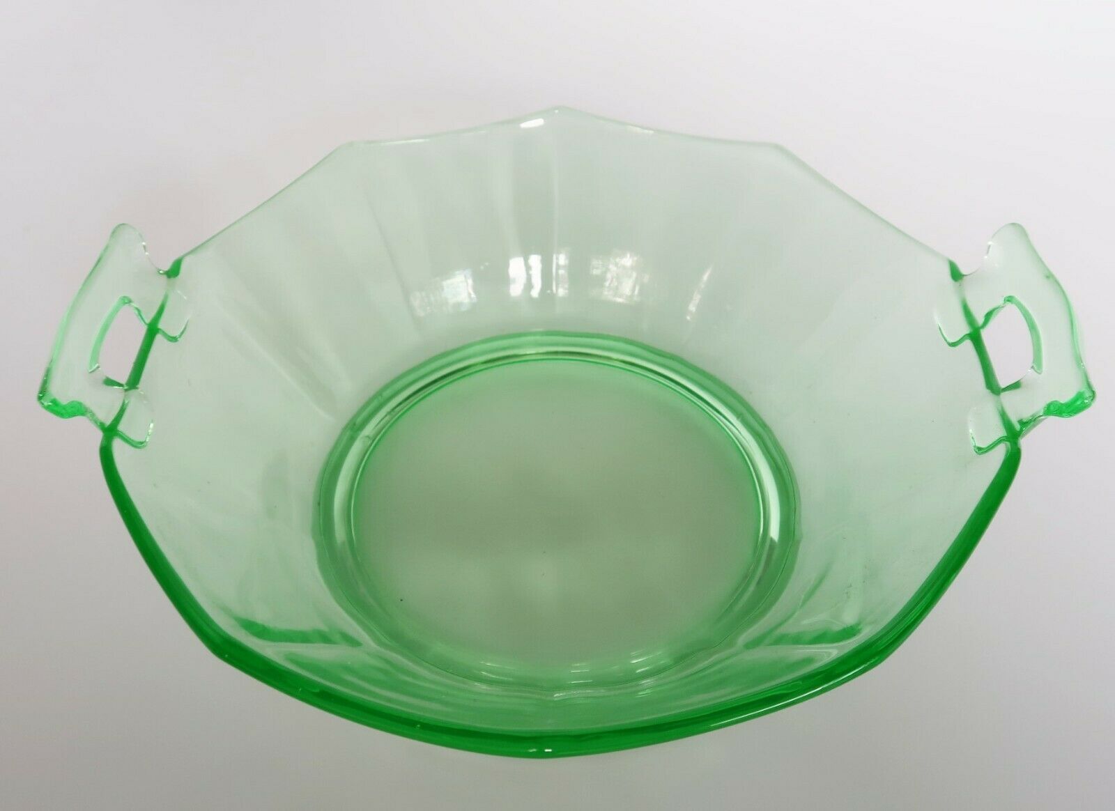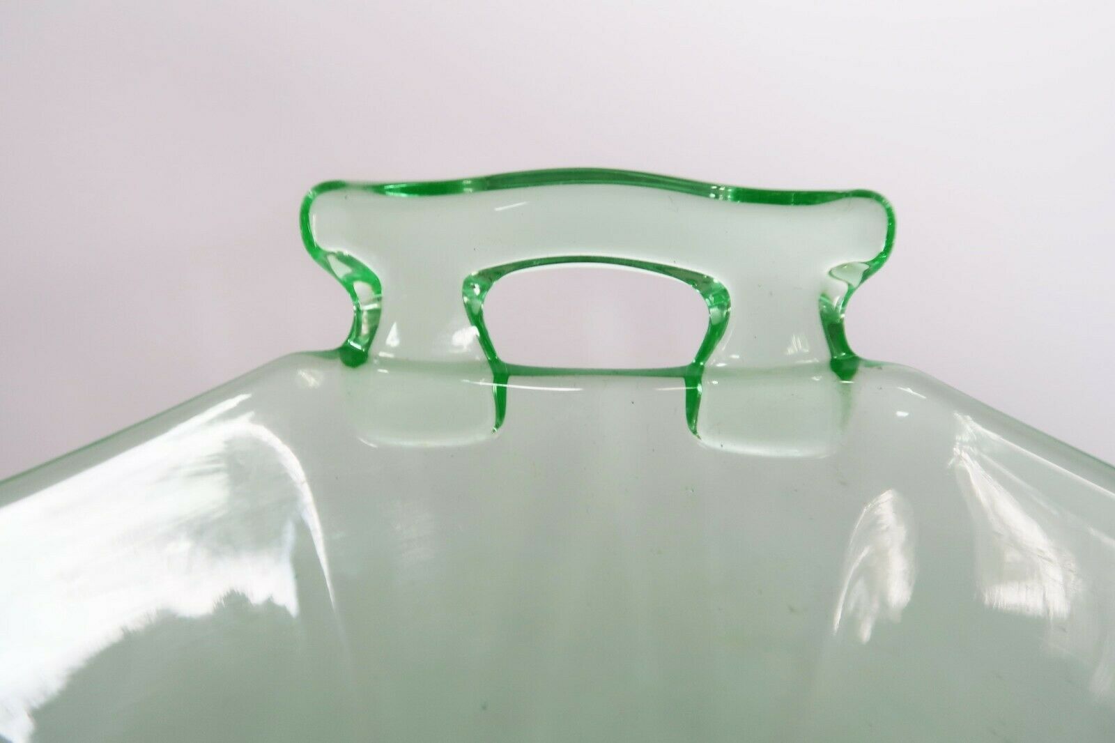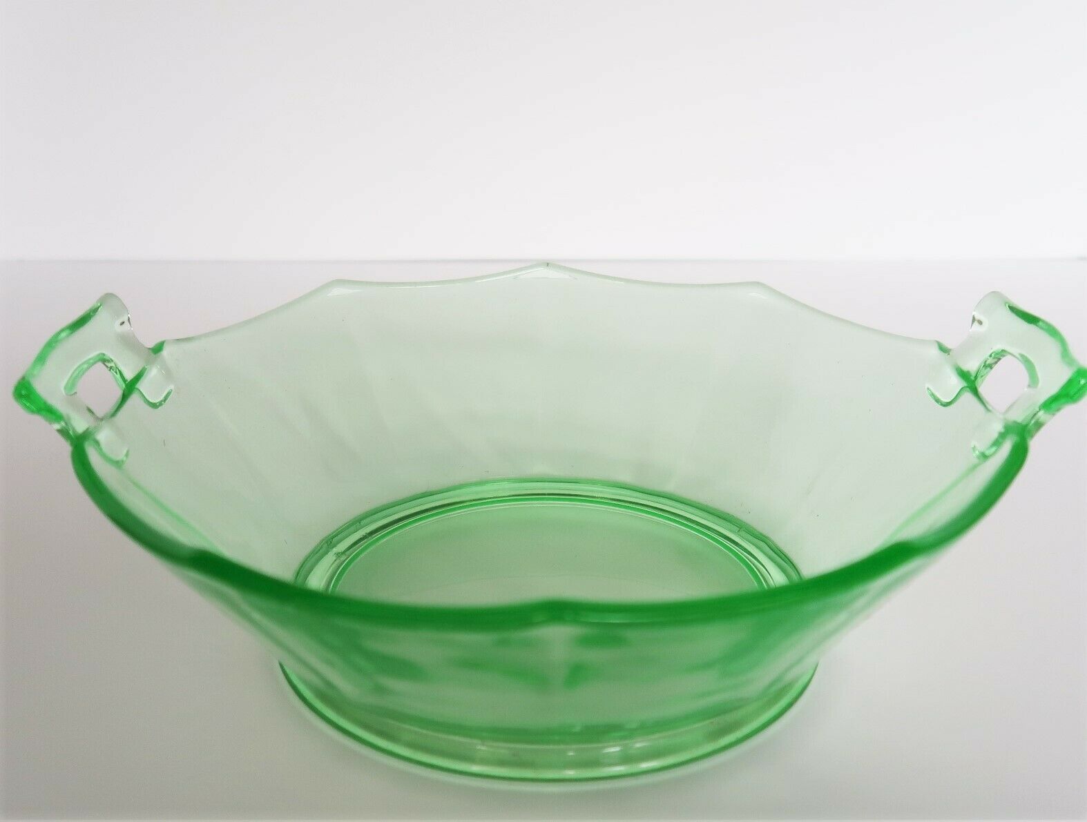 Vtg 1930's depression uranium glass serving bowl scalloped edge open handle