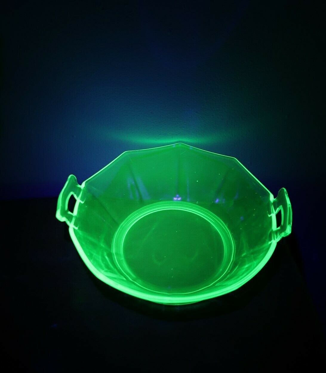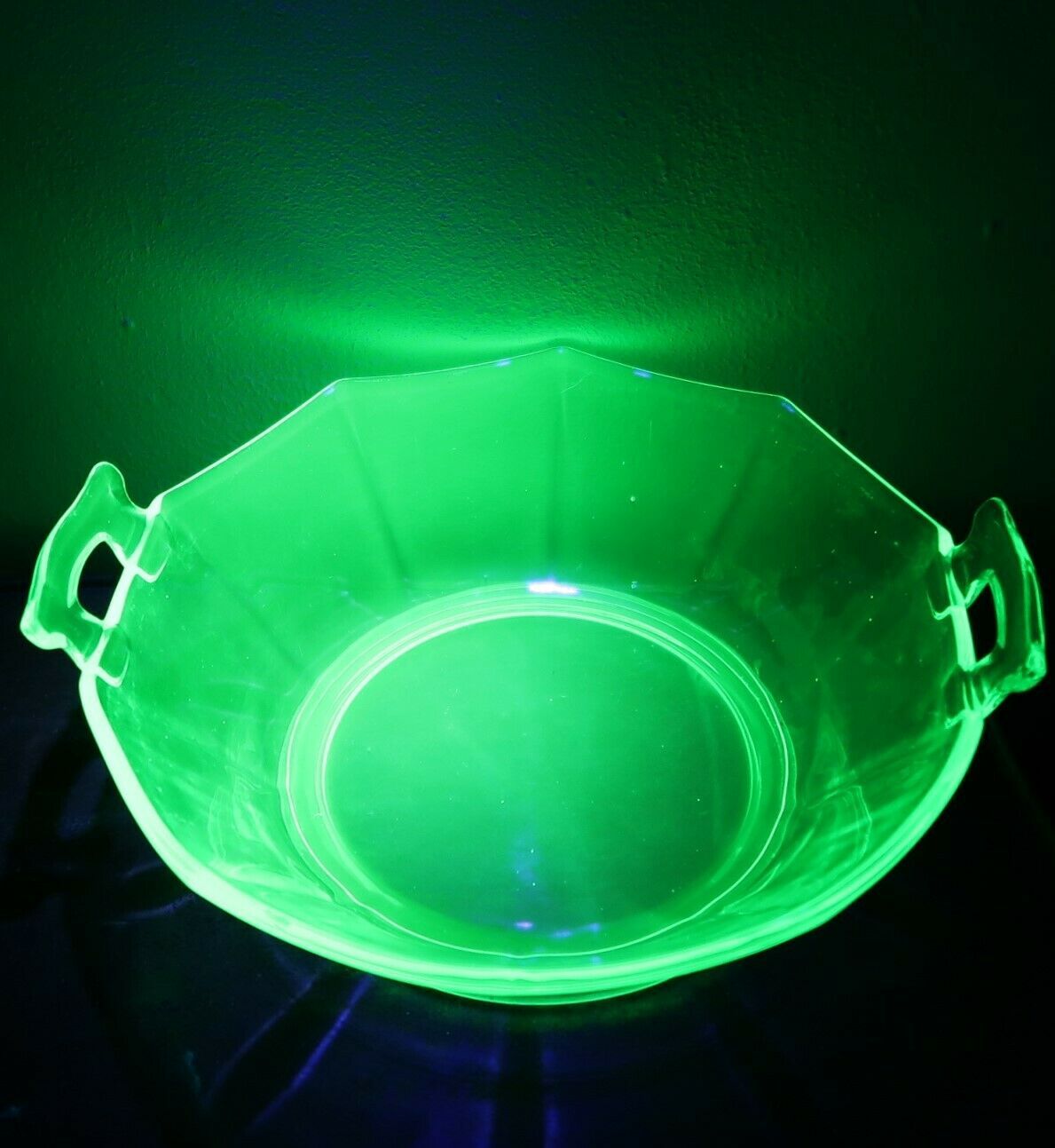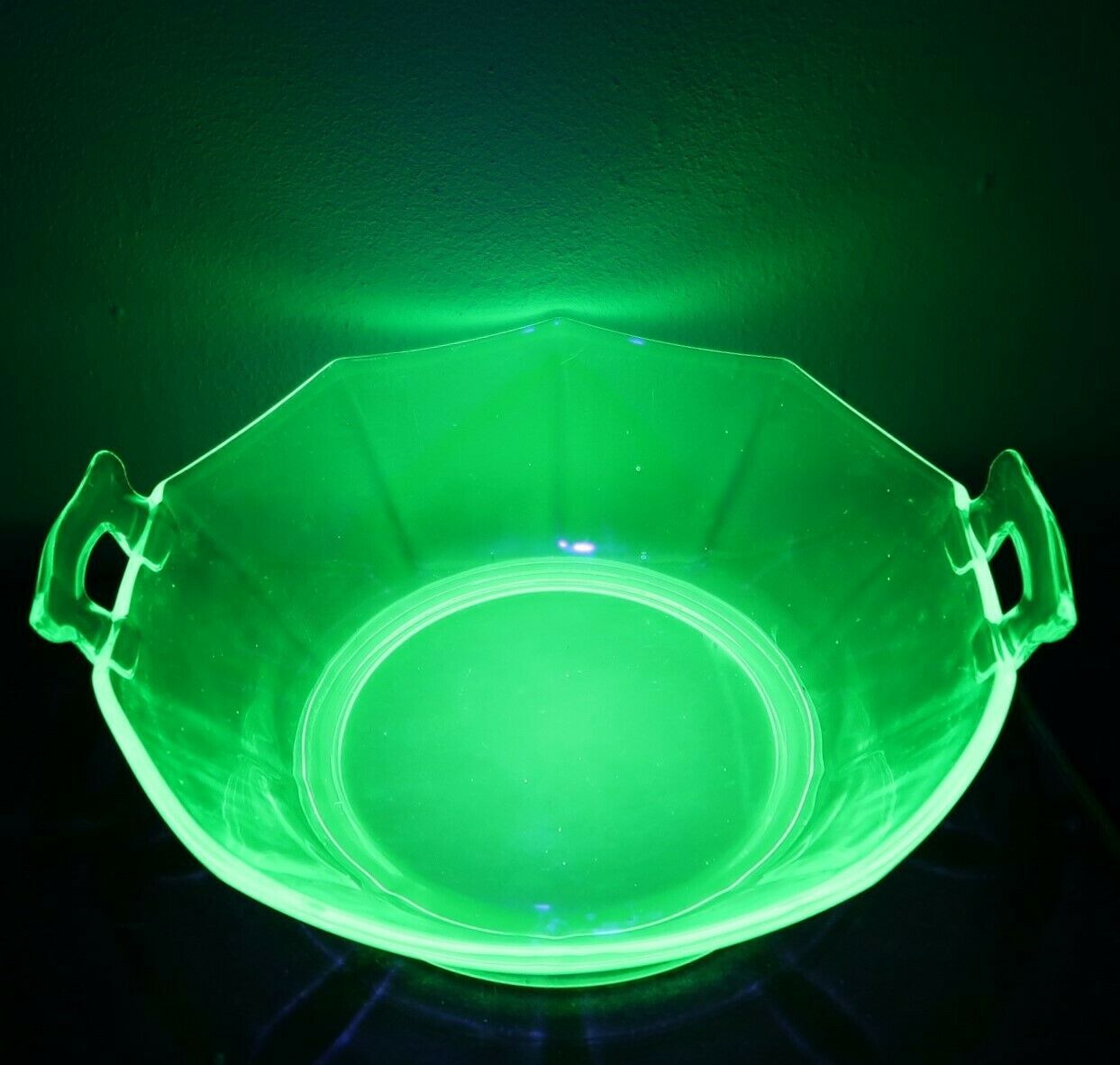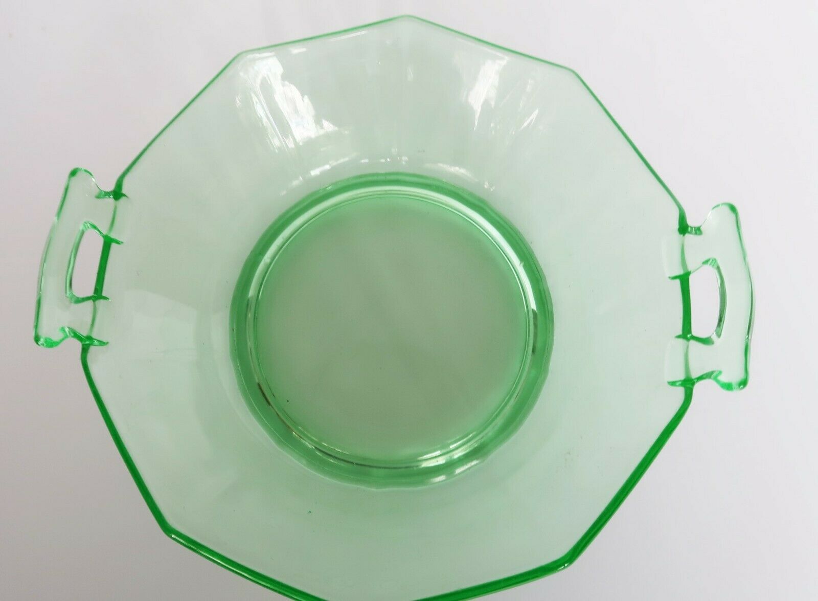 Vtg 1930's depression uranium glass serving bowl scalloped edge open handle