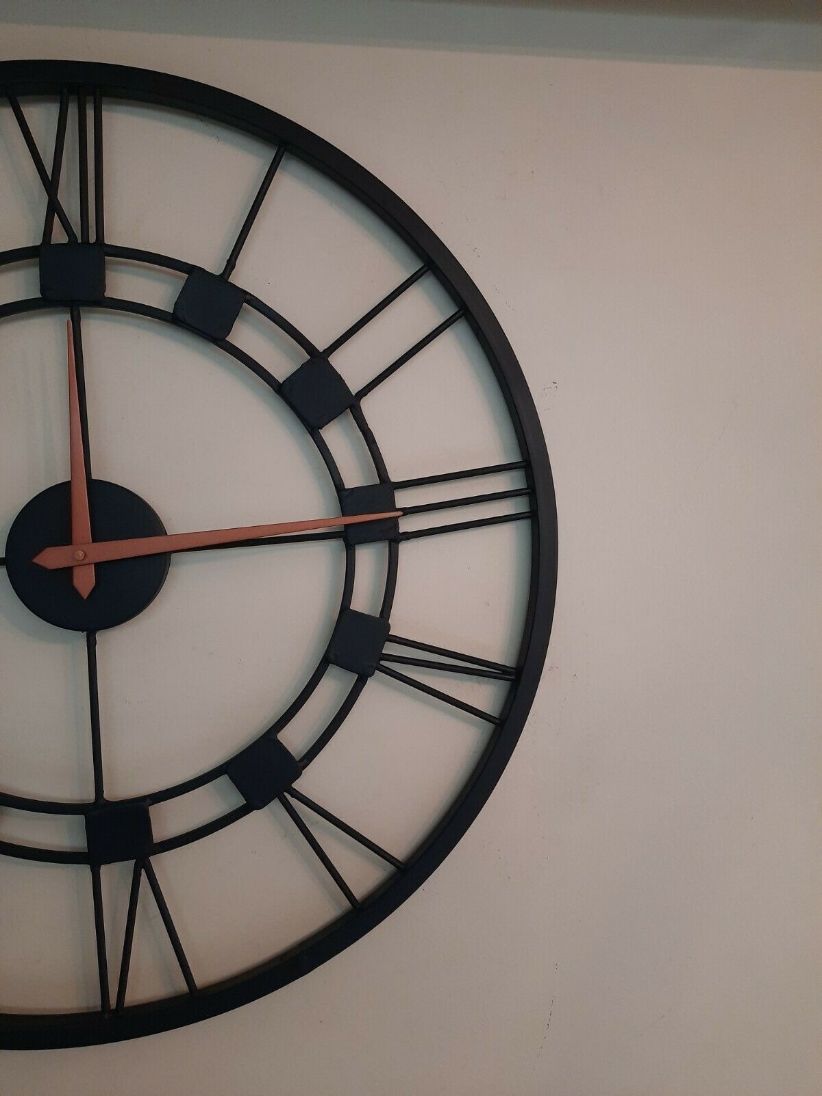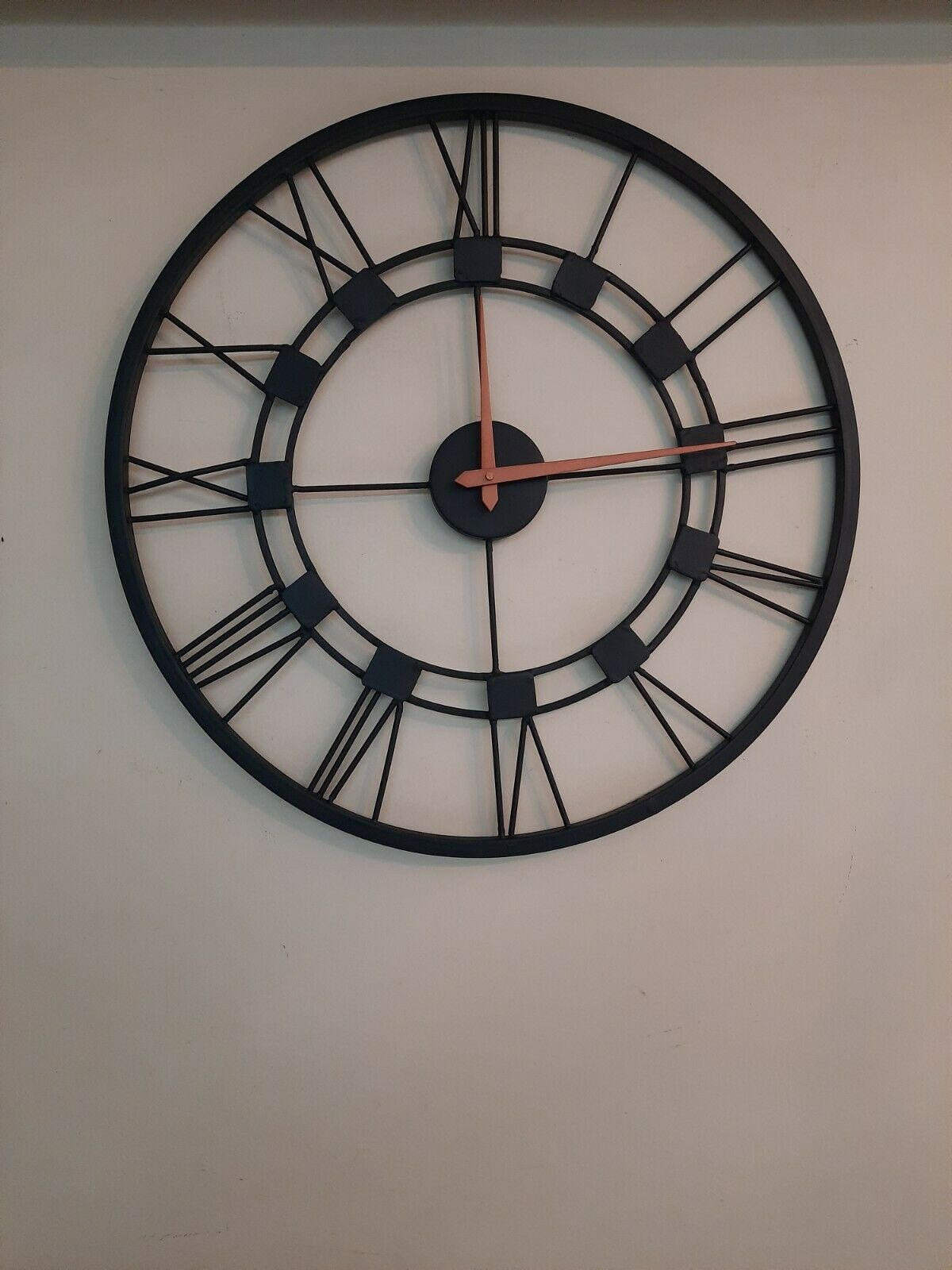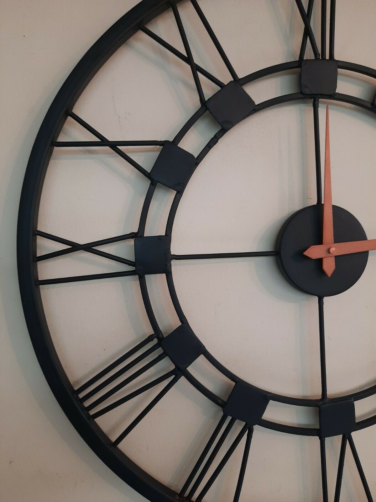 Metal Skeleton Jet Black Color Matte Finish Home Decor Wall Art Roman Vintage Antique Round big Industrial Clock is a design of the 18 th century but still a very IN design. One of our hot selling designs molded in solid metal giving it Antique Modern and Vintage look. This black beauty will embrace any color wall, because of its transparency. The size is 22 inches x 22 inches and it weighs 1kg (about 2 lbs). There is a hook given behind to hang on the wall. A good wedding gift, bridesmaid gift, groomsman gift, best friends gift. This clock is packed in bubble wrap and a corrugated box.