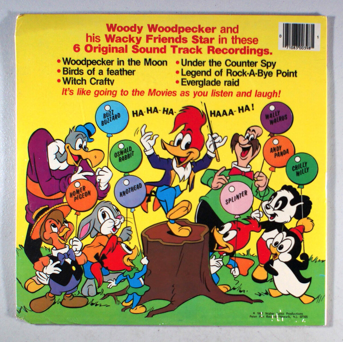 And His Wacky Friends, by Woody Woodpecker, is a 1981 children's LP from Peter Pan Records featuring the complete soundtracks of six classic Walter Lantz cartoon shorts complete with music, stories, and sound effects, making it a unique compilation that preserved theatrical cartoon audio during the era's syndicated TV reruns. The album includes beloved entries like Birds of a Feather (directed by Tex Avery), Witch Crafty, Under the Counter Spy, Woodpecker in the Moon, Legend of Rock-a-Bye Point (an Academy Award-nominated short), and Everglade Raid, highlighting historically significant works from directors such as Tex Avery, Alex Lovy, and Paul J. Smith. Its release stands out as one of the last vinyl soundtrack collections for the Woody Woodpecker series before home video formats dominated. Fan-favorites among the featured cartoons often include the zany antics in Legend of Rock-a-Bye Point.