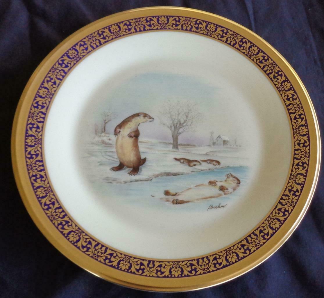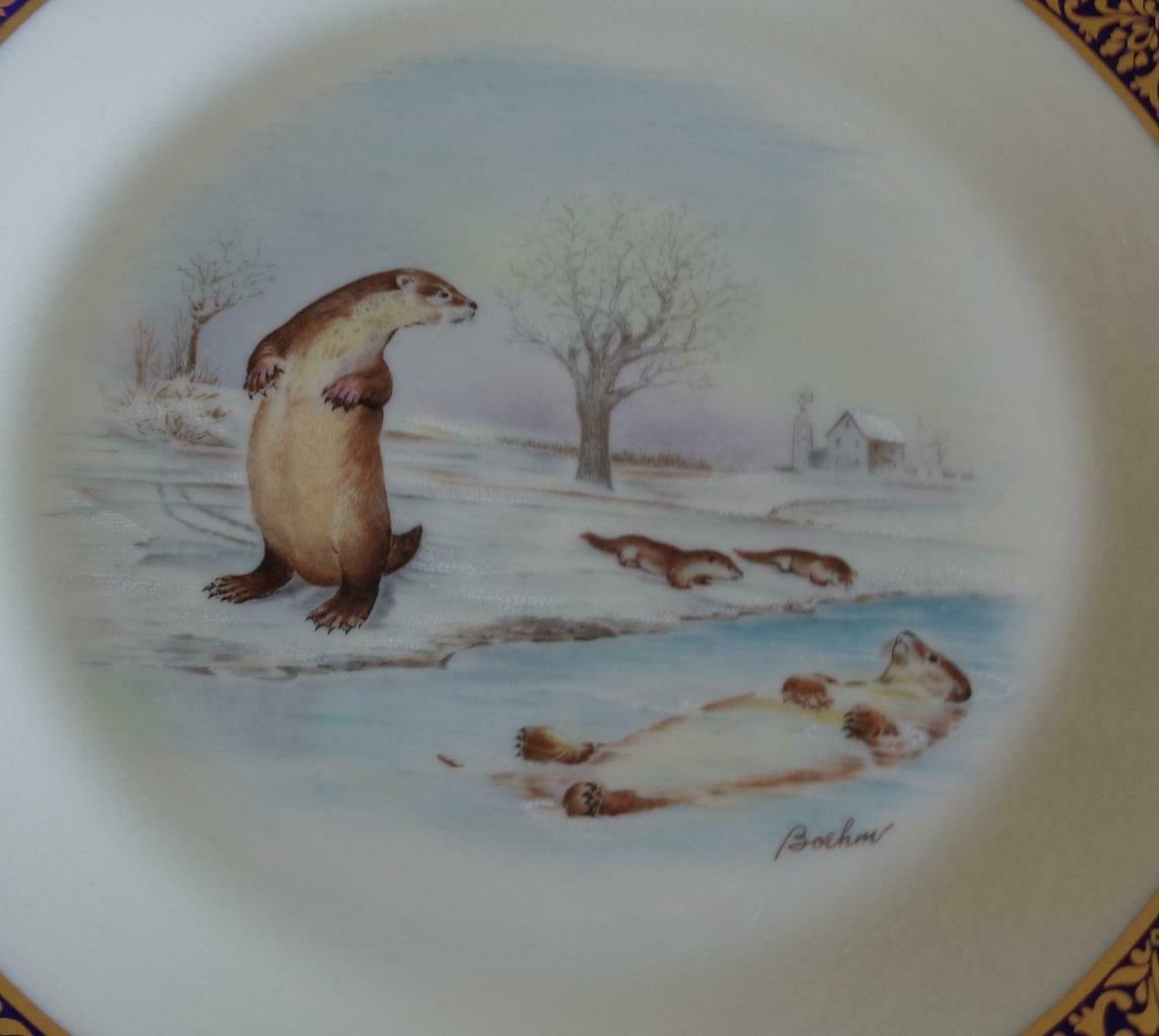 Offered here is this Gorgeous Collectible Lenox Woodland Wildlife Porcelain Plate. This is the plate that features Otters and is adapted from the original works of art designed by Boehm. The plate is dated 1982 and was an annual limited issue made in the U.S.A. It is in exceptionally good condition, with little to no sign of wear at all. It has a beautiful cobalt blue trim around the outer perimeter, with a gold design over the blue, and at the outer rim. The otter design in the center is detailed and incredibly beautiful. The plate is 10.75” in diameter. It is a gorgeous Lenox Collector’s Plate with exquisite detail and gorgeous Boehm Wildlife Art.