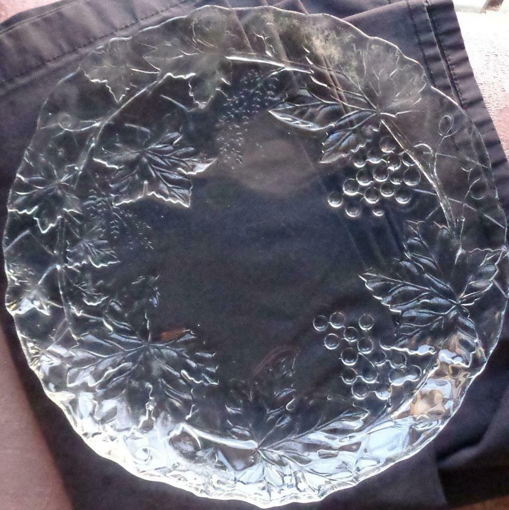 You are bidding on this nice vintage pressed glass 10.5" Dinner Plate. The plate is in very good condition, with no chips or cracks. I am unsure of the age or origins of the plate. It has a nice grapes on the vine pattern on it, and is textured on the bottom. It is 10.5" in diameter. The pattern consists of bunches of grapes on the grape vine. It is a nice glass plate, and would be a nice addition to a glassware collection.