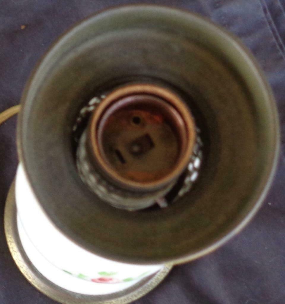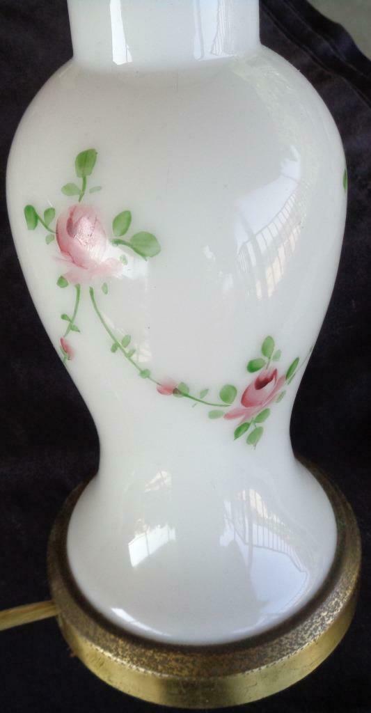 Offered here is this Beautiful Converted Liquid Milk Glass Lamp. It is in very good condition, with no chips or cracks to the milk glass. The lamp looks like it was once a liquid lamp, and it has been converted to electric. It is in working condition but is missing the little on/off switch on the side, but the stem of the switch is there, so a new little switch could be screwed on. I am unsure of the age or origins of the lamp. It has a hand painted pink rose design on it that is delicate and lovely. The lamp is 10.25” tall, 3” in diameter at the top, and 4.25” in diameter at the base, which has been felted on the bottom. This is a lovely, converted vintage liquid lamp that makes a beautiful decorative statement.