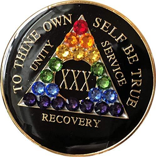 30 Year Black Tri-Plate AA Medallion With Rainbow Color Swarovski Crystals Installed By Persons In Recovery. Made By Recovery Mint. Serenity Prayer On Back. Glass Like Epoxy Dome For A Premium Look And Feel - Size is 1 5/16" or 34x3mm