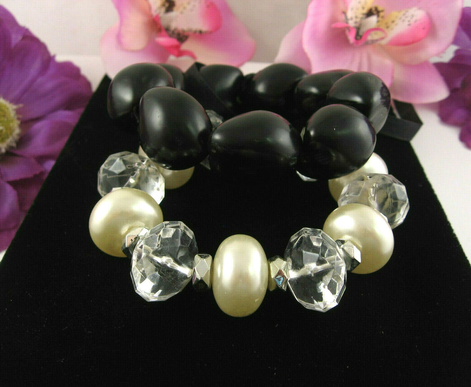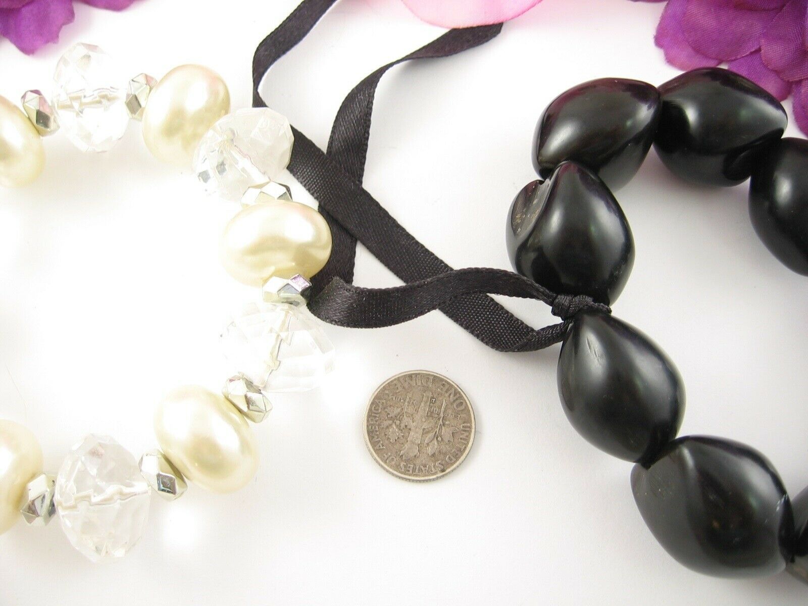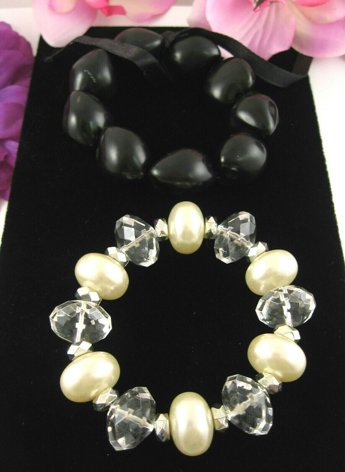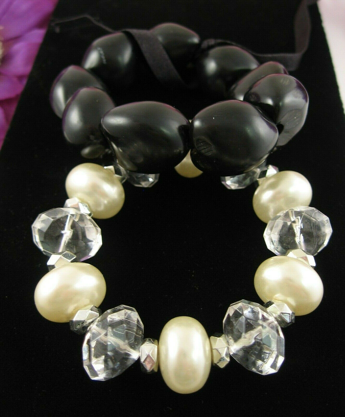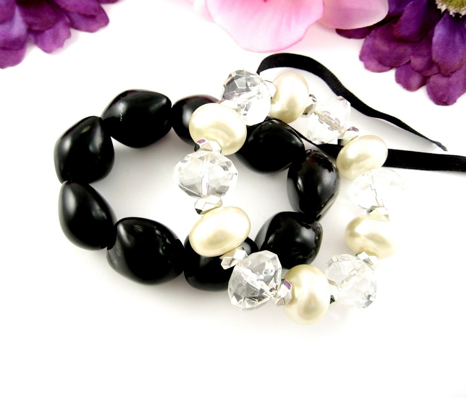 Vintage Pair BEADED BRACELETS Black White 2 Clear Chunky Elastic Stretch Costume