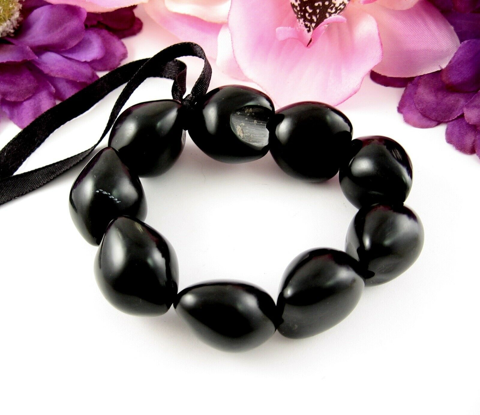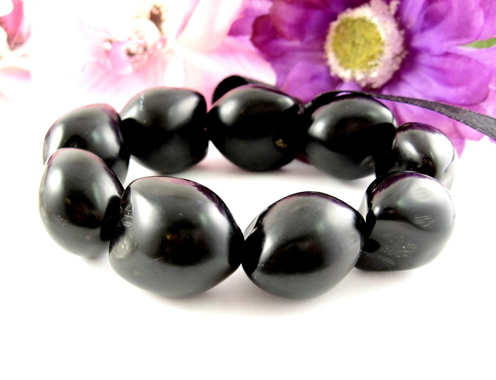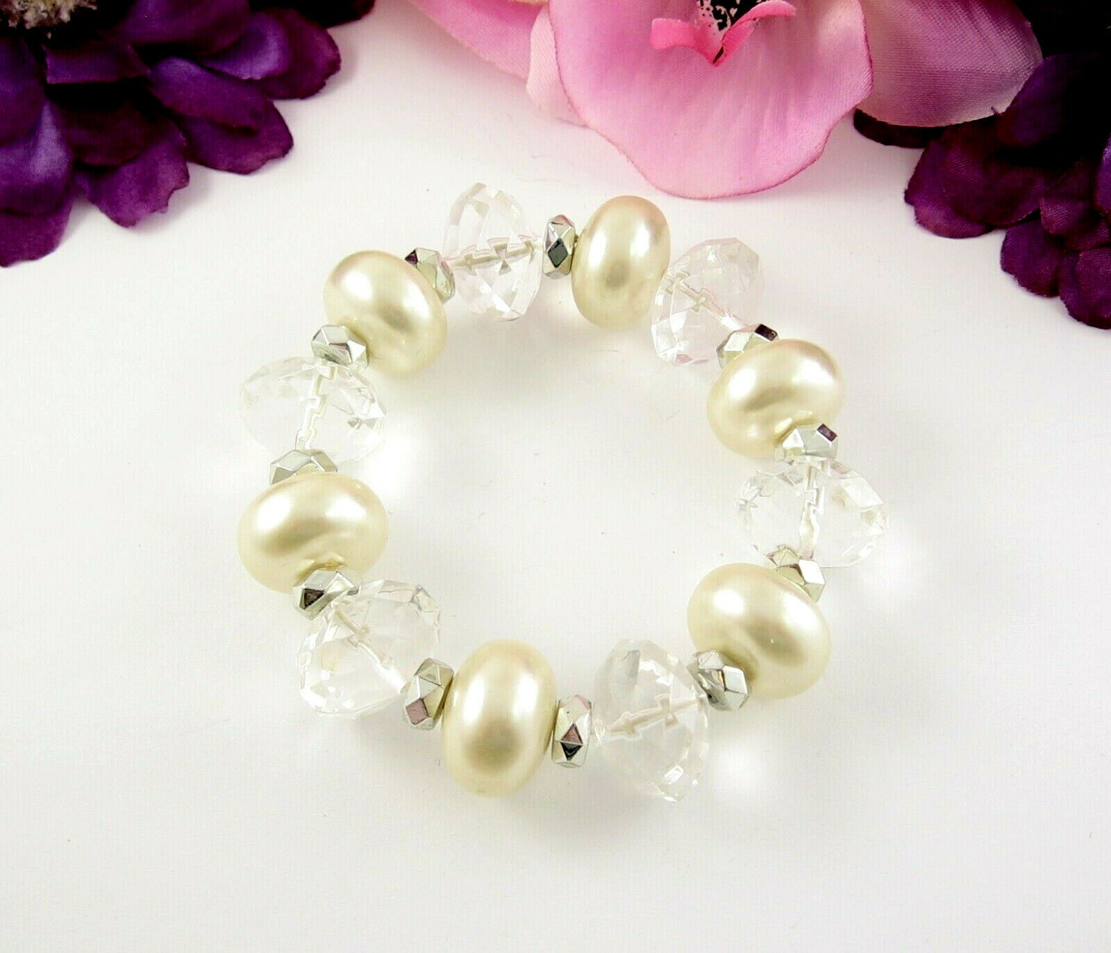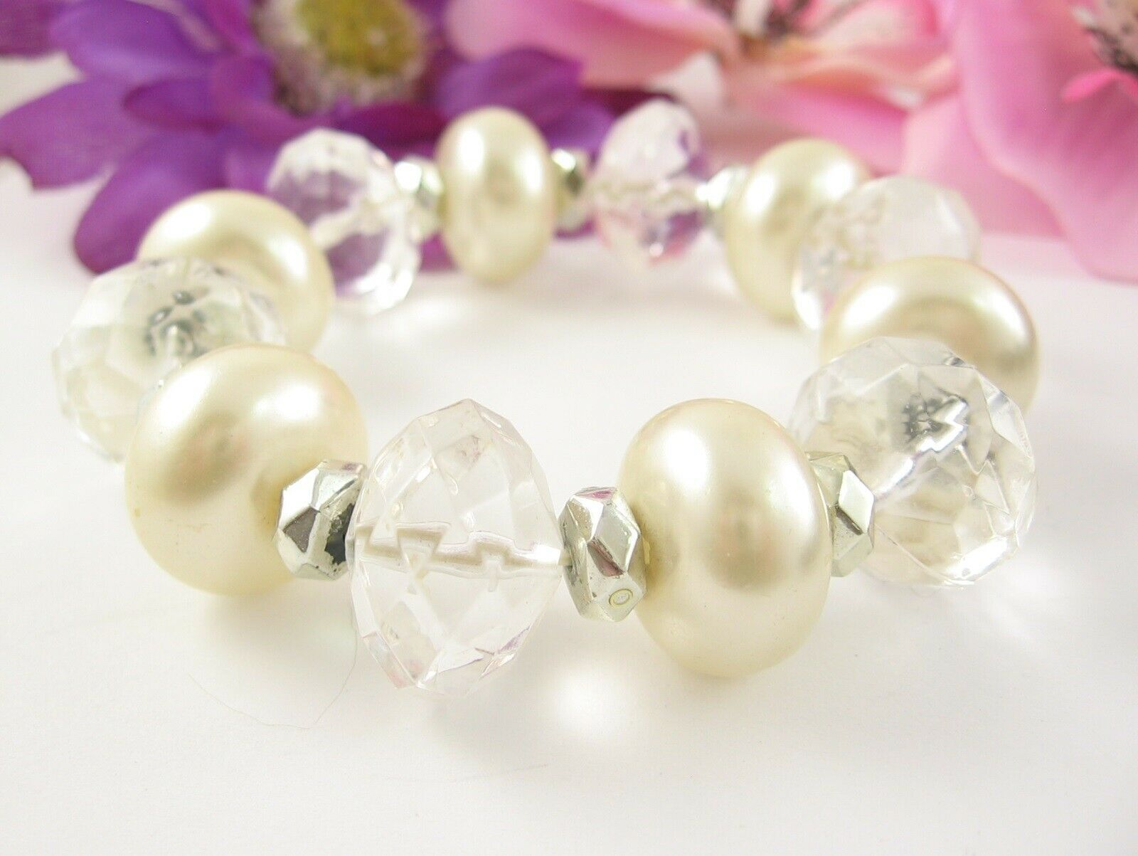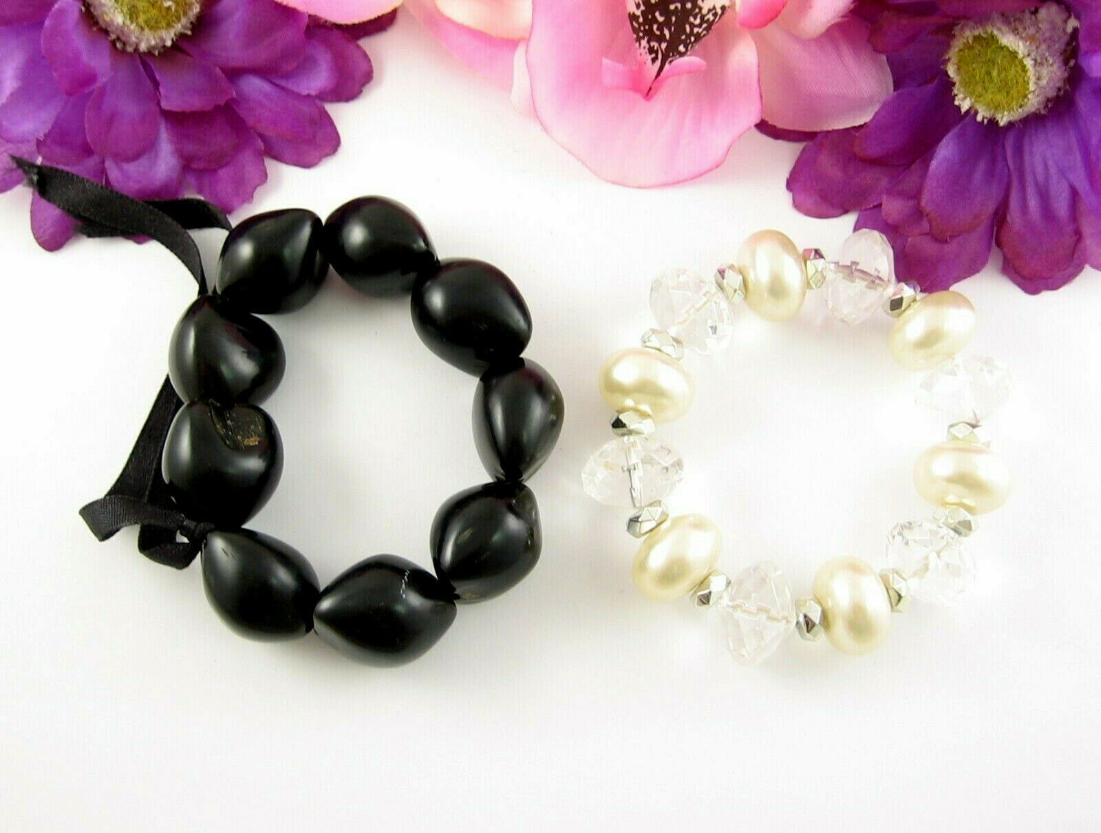 Vintage Pair BEADED BRACELETS Black White 2 Clear Chunky Elastic Stretch Costume