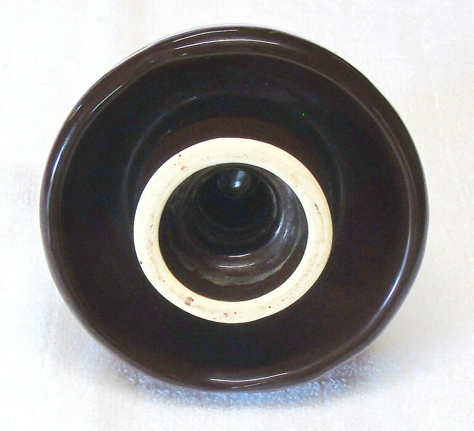 Brown ceramic insulator,measures 4 3/4" at the bottom, 3" at the top and the height is 4". Insulator is marked and shown in picture 5.