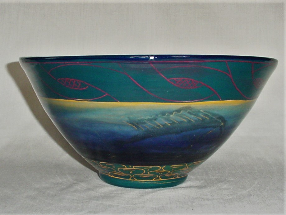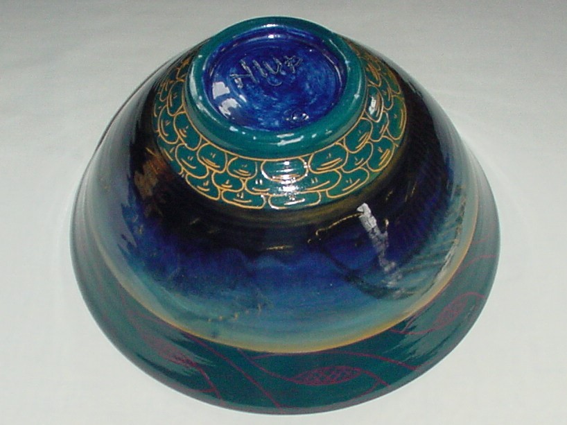 BEAUTIFUL BLUE GREEN RED GOLD ART POTTERY BOWL SIGNED NWP