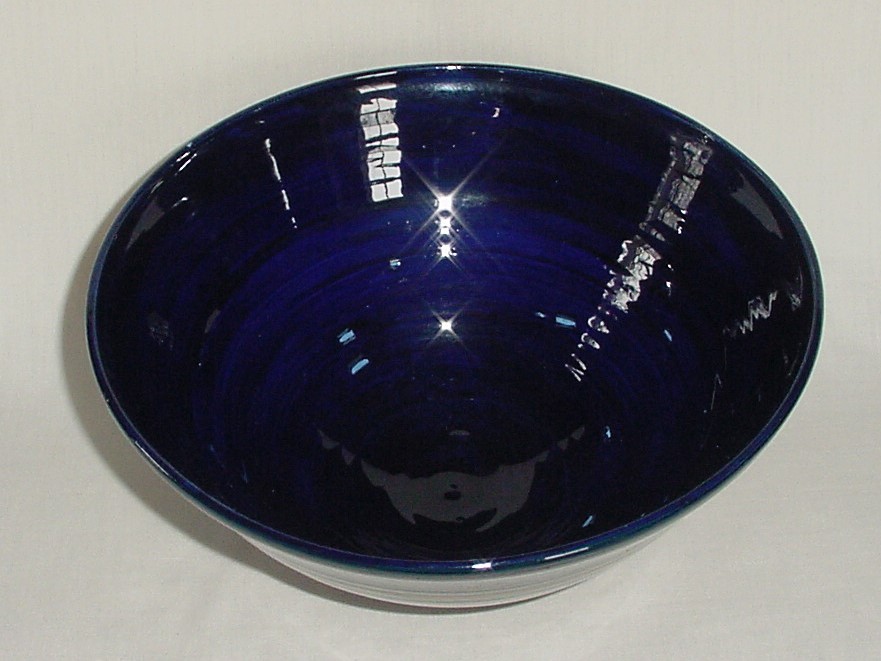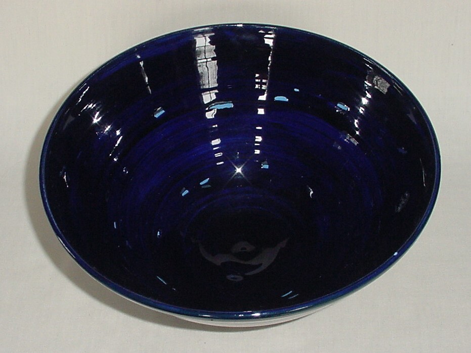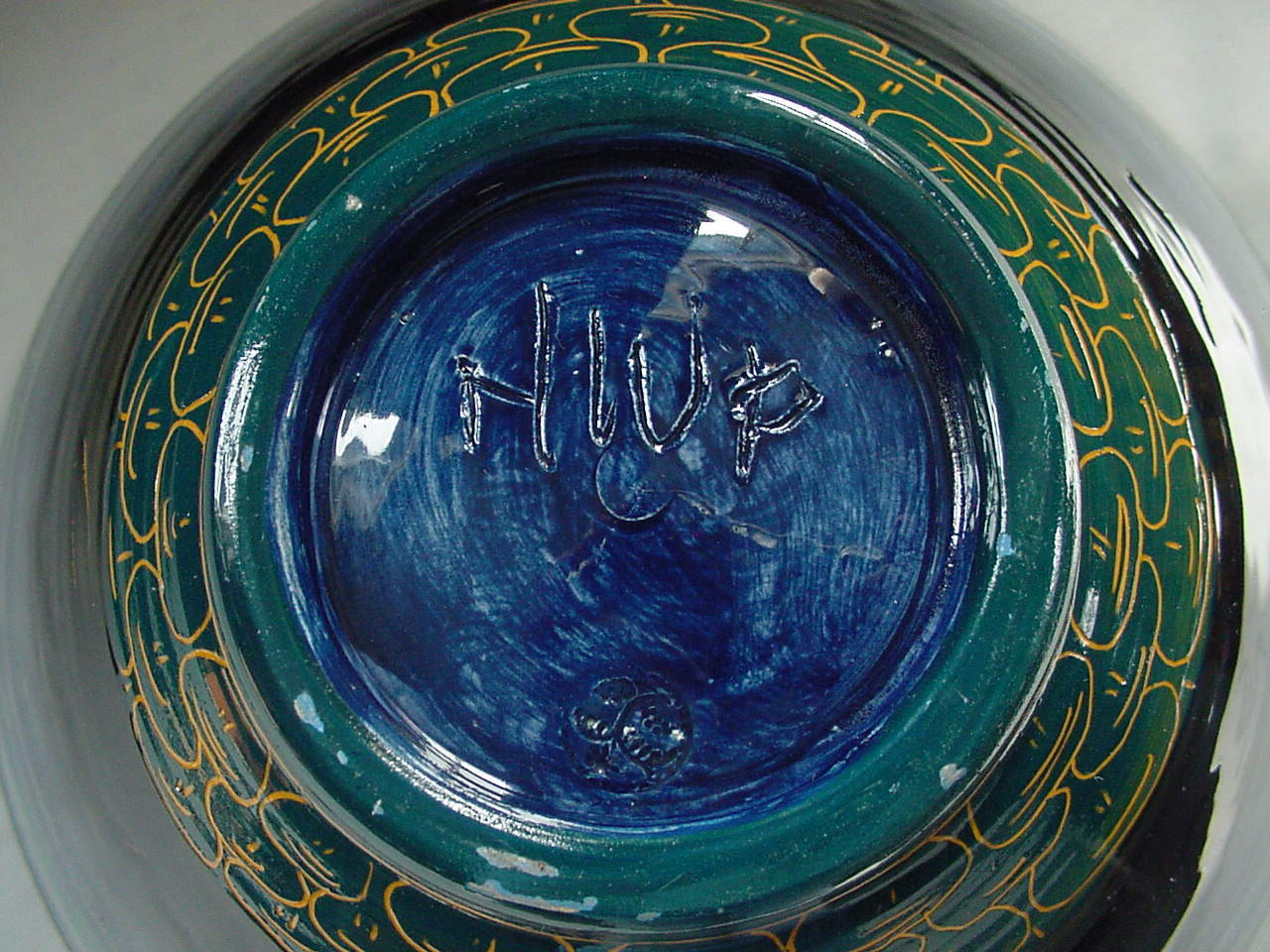 Beautiful large art pottery bowl, with various shade of blues and greens blending into each other. Also has decorations in red and gold. The interior is a cobalt blue, but has a number of glaze pops where a lighter blue shows through. This is wonderful for display and the glaze pops do not mar the beauty, but it is not suitable for food service. The bowl is in great condition otherwise and measures approximately 10 1/2" in diameter and is about 5" high. Signed on the bottom, NWP. Insurance and tracking included in USPS shipping.