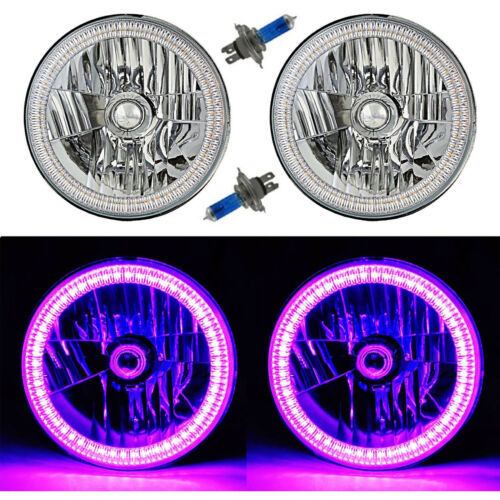 THIS LISTING IS FOR A NEW PAIR (2 bulbs) OF 7" 12 VOLT HIGH/LOW BEAM HALOGEN HEADLIGHTS WITH PURPLE SMD 45-LED HALO ANGEL EYE RINGS. THESE HALO RINGS ARE EXTREMELY BRIGHT AND CAN EASILY BE SEEN DURING THE DAY AND NIGHT EVEN WITH THE HEADLIGHT ON. THESE HEADLIGHTS HAVE GLASS LENSES. THESE LIGHT UP 50% BRIGHTER AND WHITER COMPARED TO THE STANDARD STOCK STYLE INCANDESCENT HEADLIGHT BULBS. INCLUDES HALOGEN 60/55W H4 SUPER WHITE LIGHT BULBS. THESE HAVE THE ORIGINAL 3 PRONG PLUG DESIGN ON THE BACK SO THEY WILL PLUG RIGHT INTO THE ORIGINAL WIRING HARNESS. LED RING IS POWERED WITH A POWER AND GROUND WIRE THAT CAN BE SPLICED DIRECTLY TO THE CARS 12V ELECTRICAL SYSTEM. HALO RINGS CAN BE CONNECTED TO PARKING LIGHTS, TURN SIGNALS, HEADLIGHTS, OR A SEPARATE SWITCH. THESE ARE DOT SAE APPROVED. WE WILL TAKE EXTRA CARE IN PACKAGING.