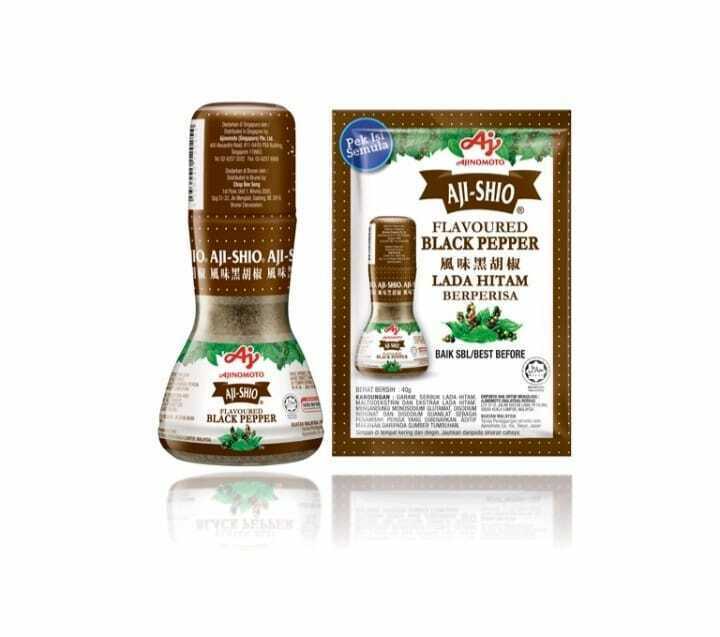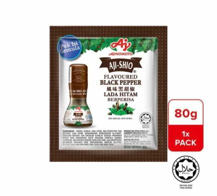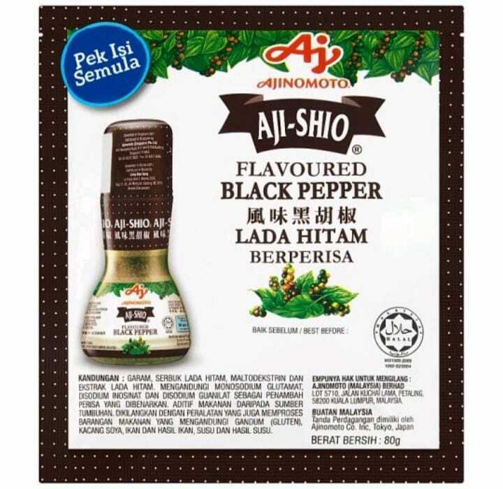 AJI-SHIO Flavoured Pepper is made from the best quality pepper, gives a strong pepper aroma and taste together with the convenience of added flavouring.Aji-Shio flavoured pepper is made from the premium quality pepper, specially fused with permitted flavourings to give a strong aroma and taste to your foods. It is perfect also for adding the extra spicy pepper aroma into porridge, soup, eggs and meat dishes.