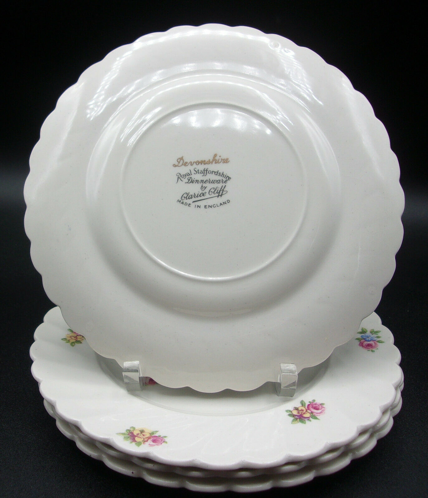 All four bread plates have been used, but still have a nice gloss glaze, are free of cracks and chips, and still bear the gold "Devonshire" signature above the black glazed insignia "Royal Staffordshire Dinnerware by Clarice Cliff, Made in England" to the underside of each plate.