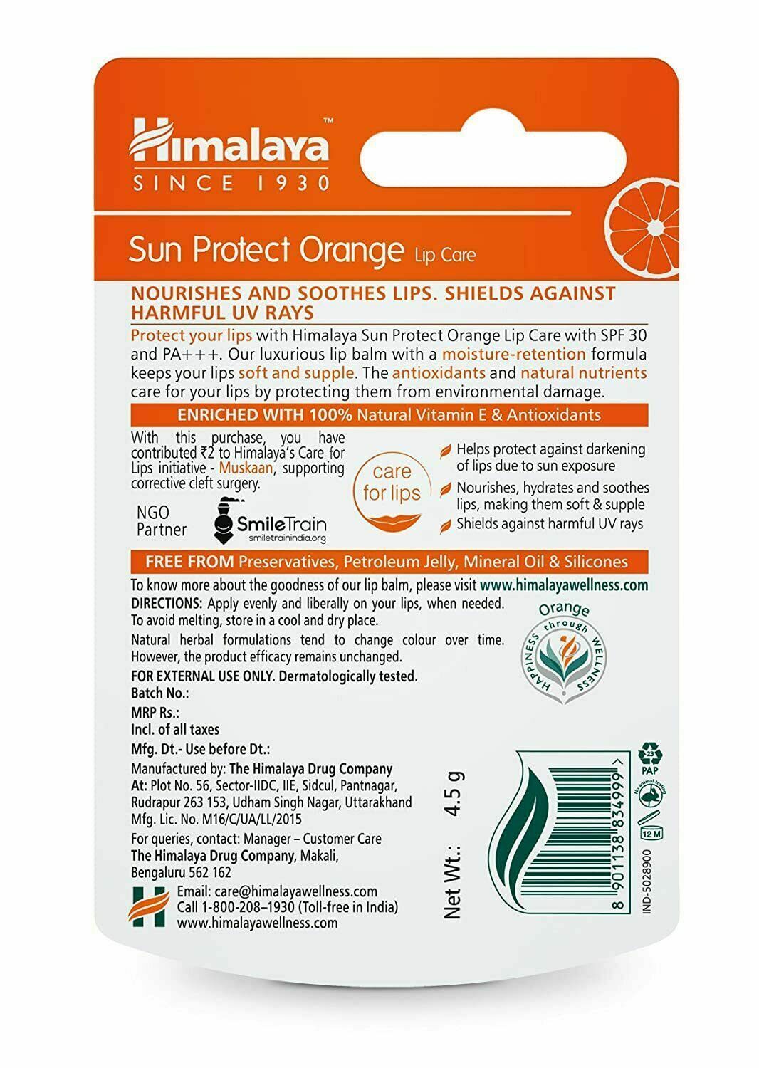 Himalaya Herbal Sun Protect ORANGE Lip Care Lip Balm SPF 30 PA+++4.5gm FREE SHIP
