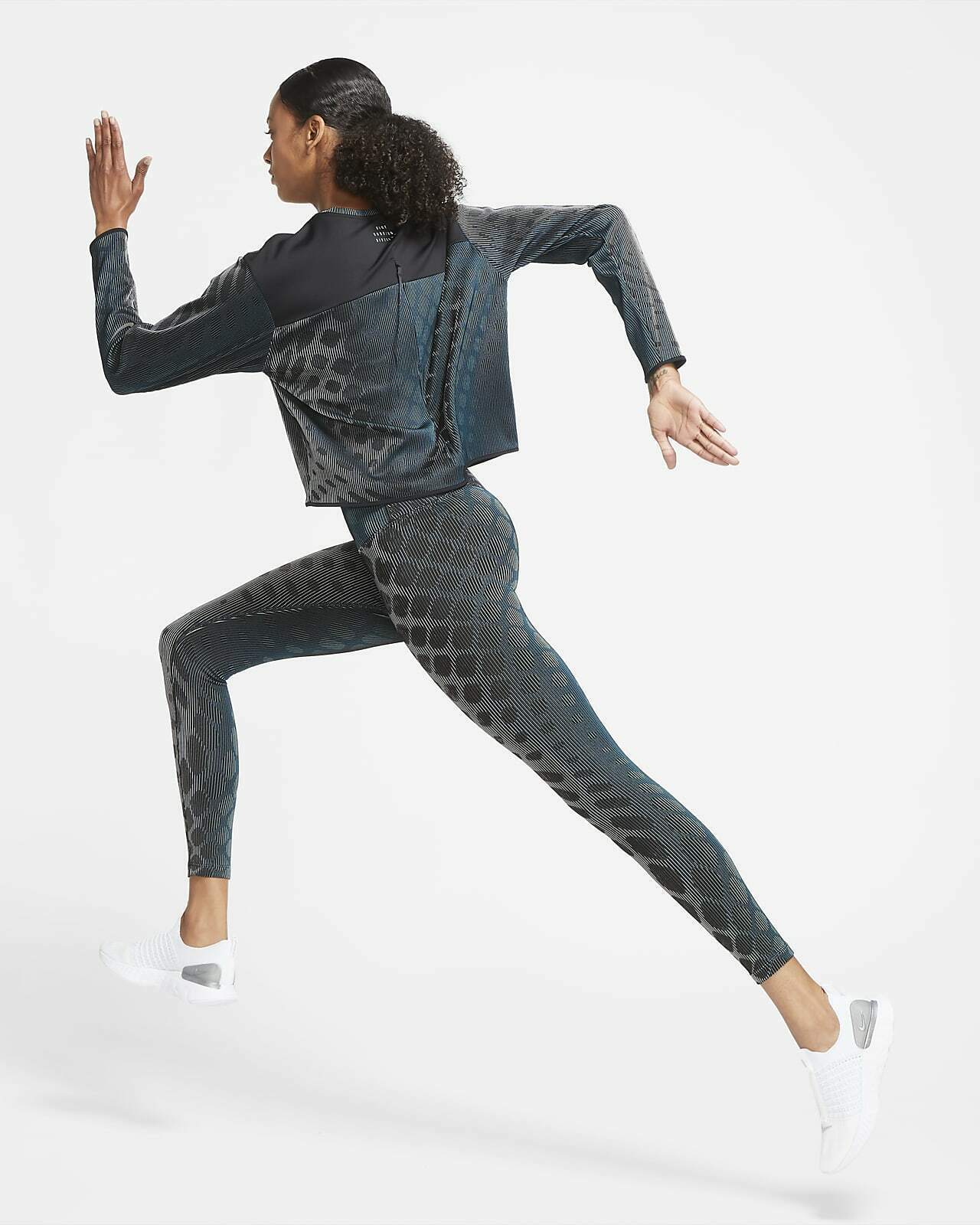 They have an aerodynamic construction and are made of breathable material. In addition, they have Dri-FIT technology that removes moisture and keeps the skin dry. The elastic waist is provided with mesh to prevent overheating and has an adjustable lace on the inside. The tights have integrated a media pocket with a zipper for storing the phone. Designed for running, they have reflective elements.