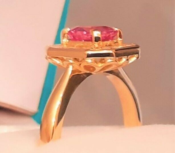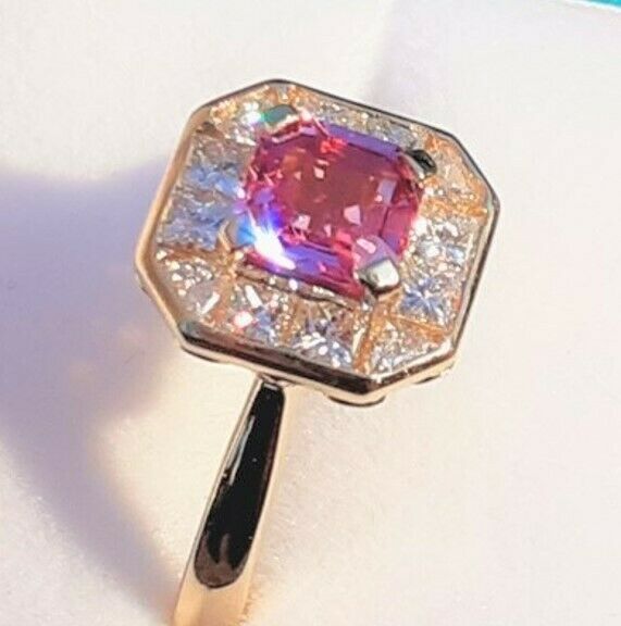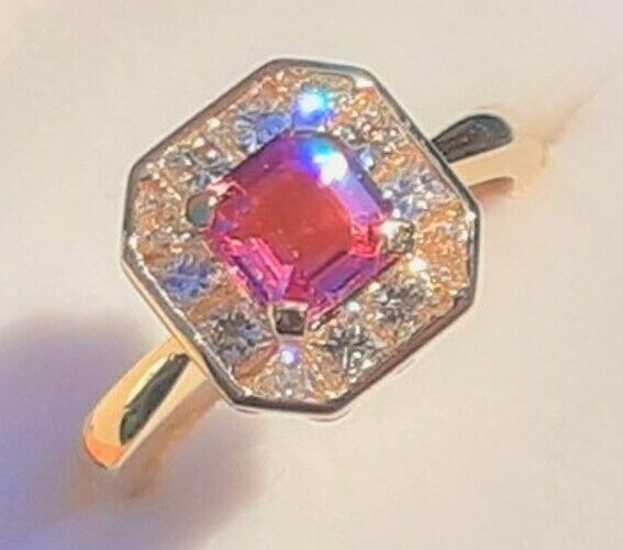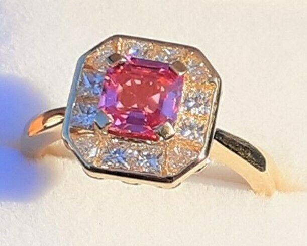 BEAUTIFULL PINK SAPPHIRE,OCTAGON SHAPE 1.05CT ,5.7X5.7X3.03MM,VVS.SET IN A DECO VINTAGE STYLE 18CT YELLOW GOLD RING SETTING.DIAMONDS = 8 X PRINCESS CUT 4 X TRILLION ,G COLOUR, VS CLARITY.0.68CT TOTAL DIAMOND WEIGHT.RING IS SIZABLE (FREE OF CHARGE)PLEASE MESSAGE FOR MORE INFO OR IMAGES