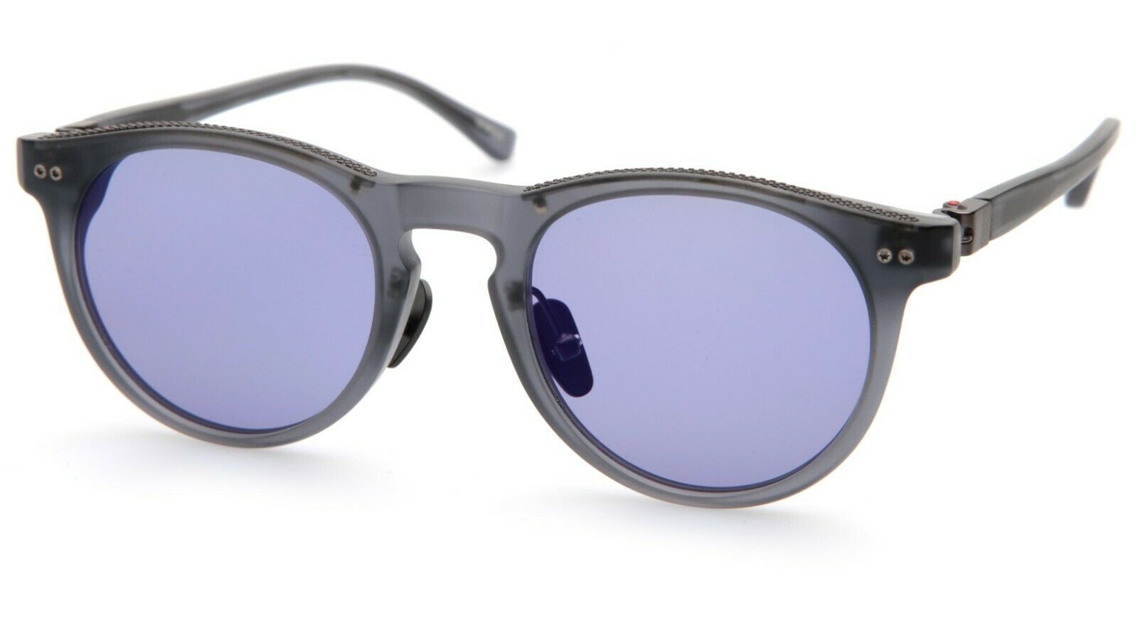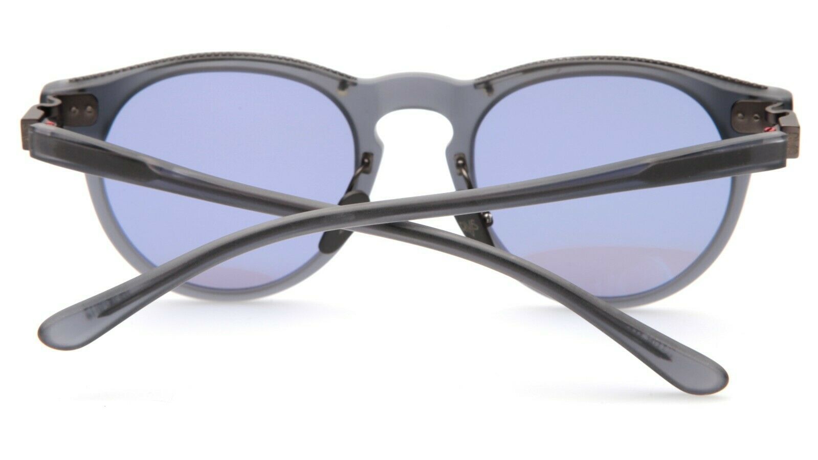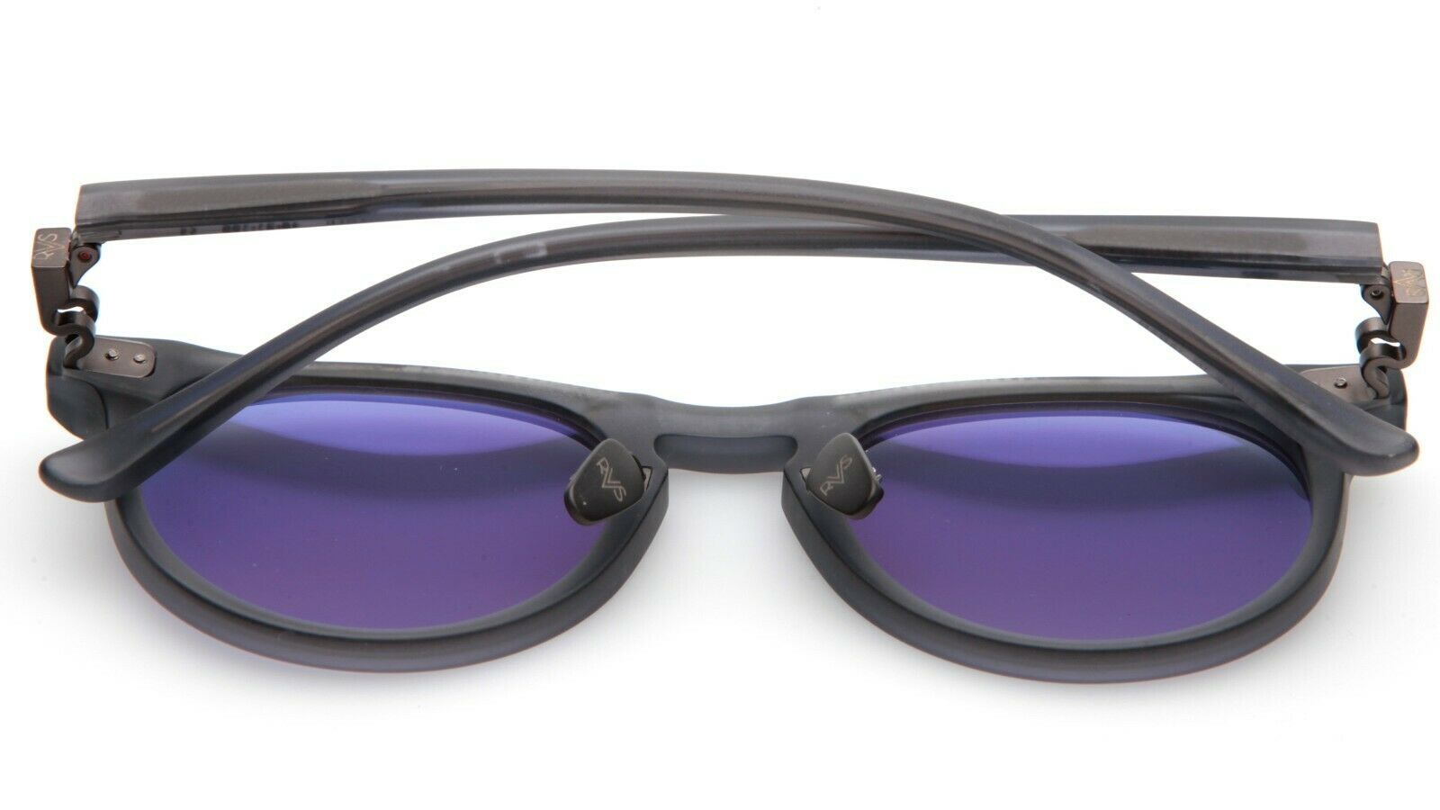 These super stylish sunglasses, by New York brand RVS Eyewear, feature a unique transparent grey acetate frame and blue tinted lenses. Meticulously hand crafted in Japan with the finest Japanese materials and signature matte finish. Unisex design. Dimensions: 48-21-140.