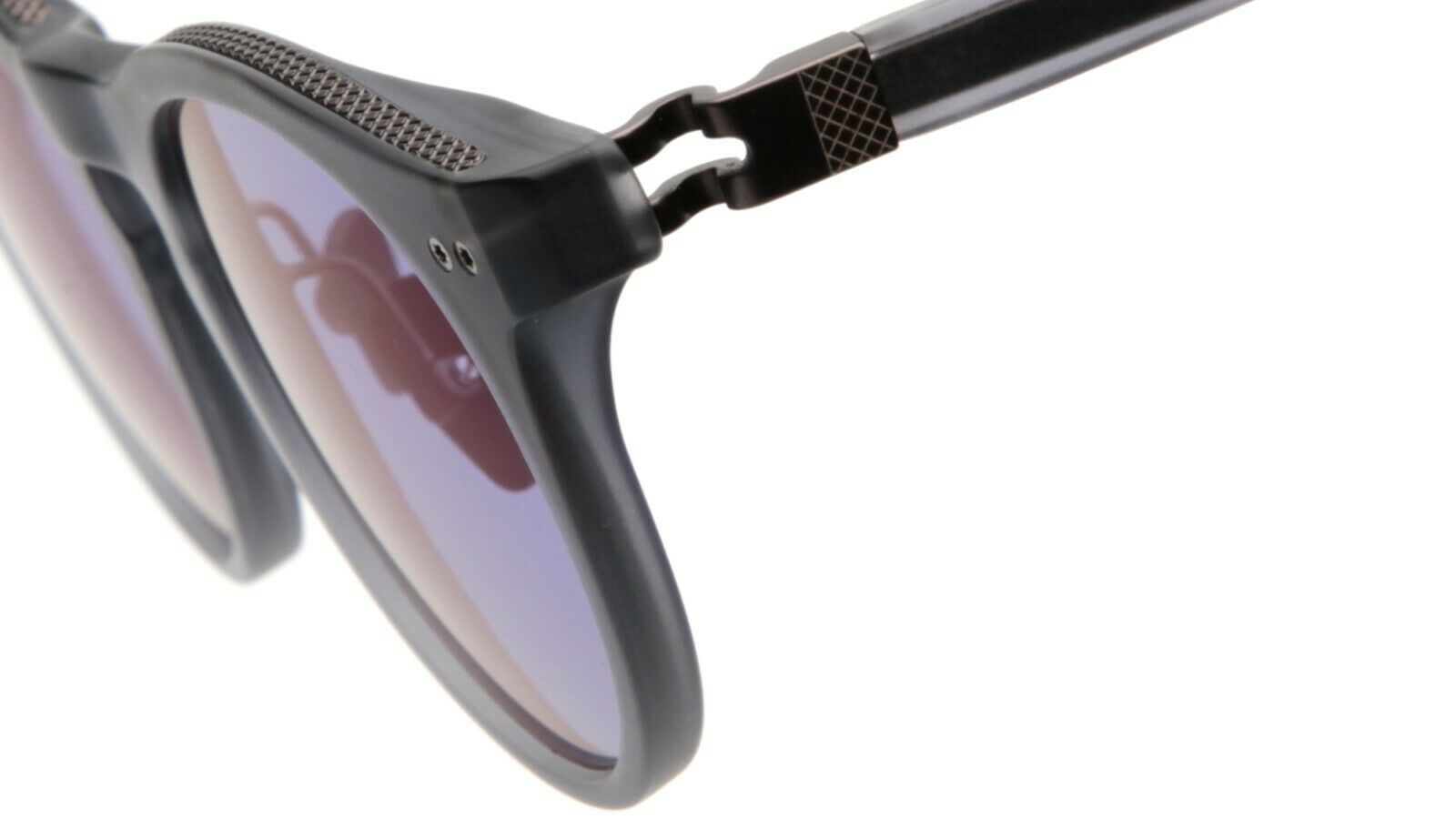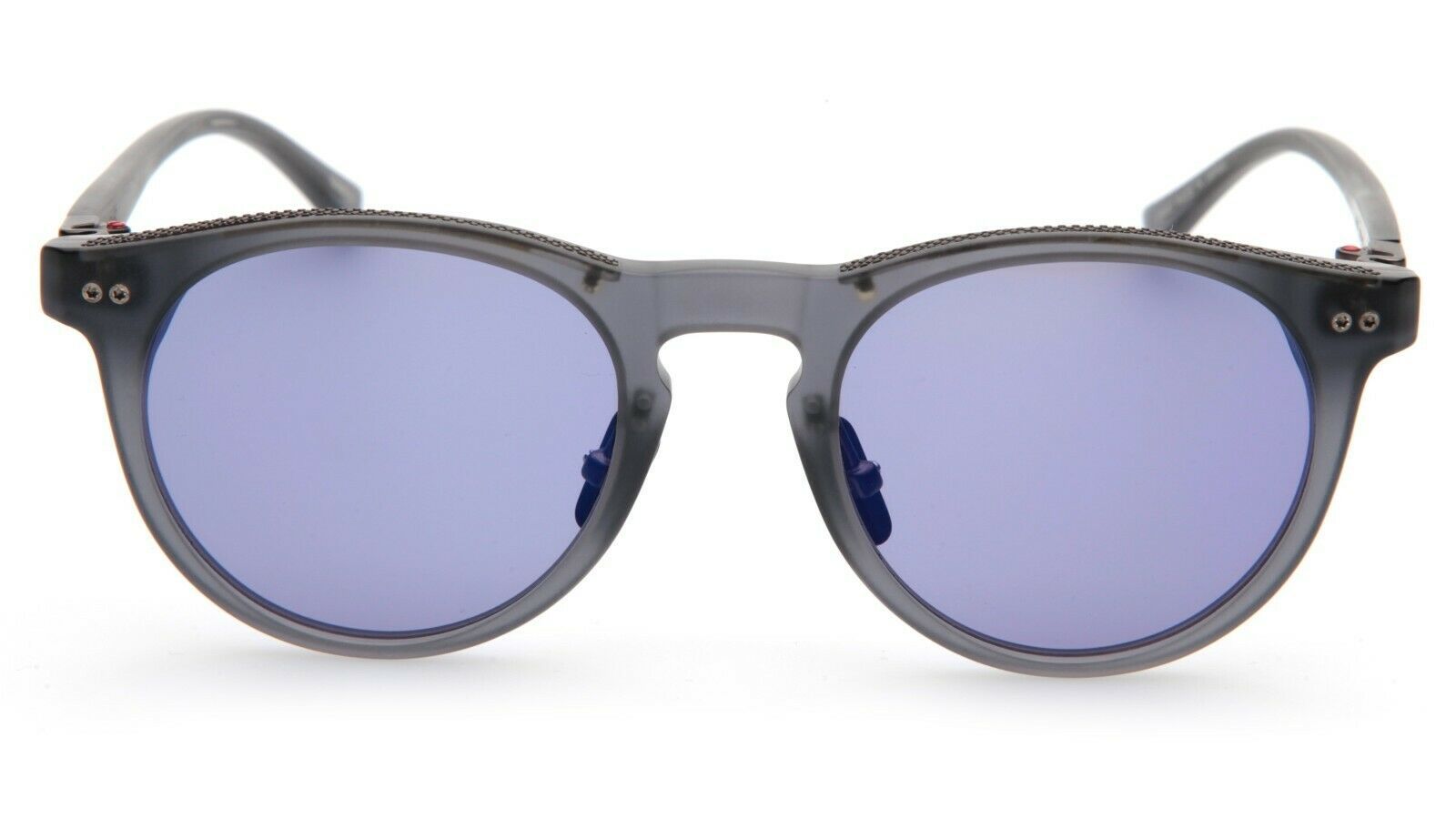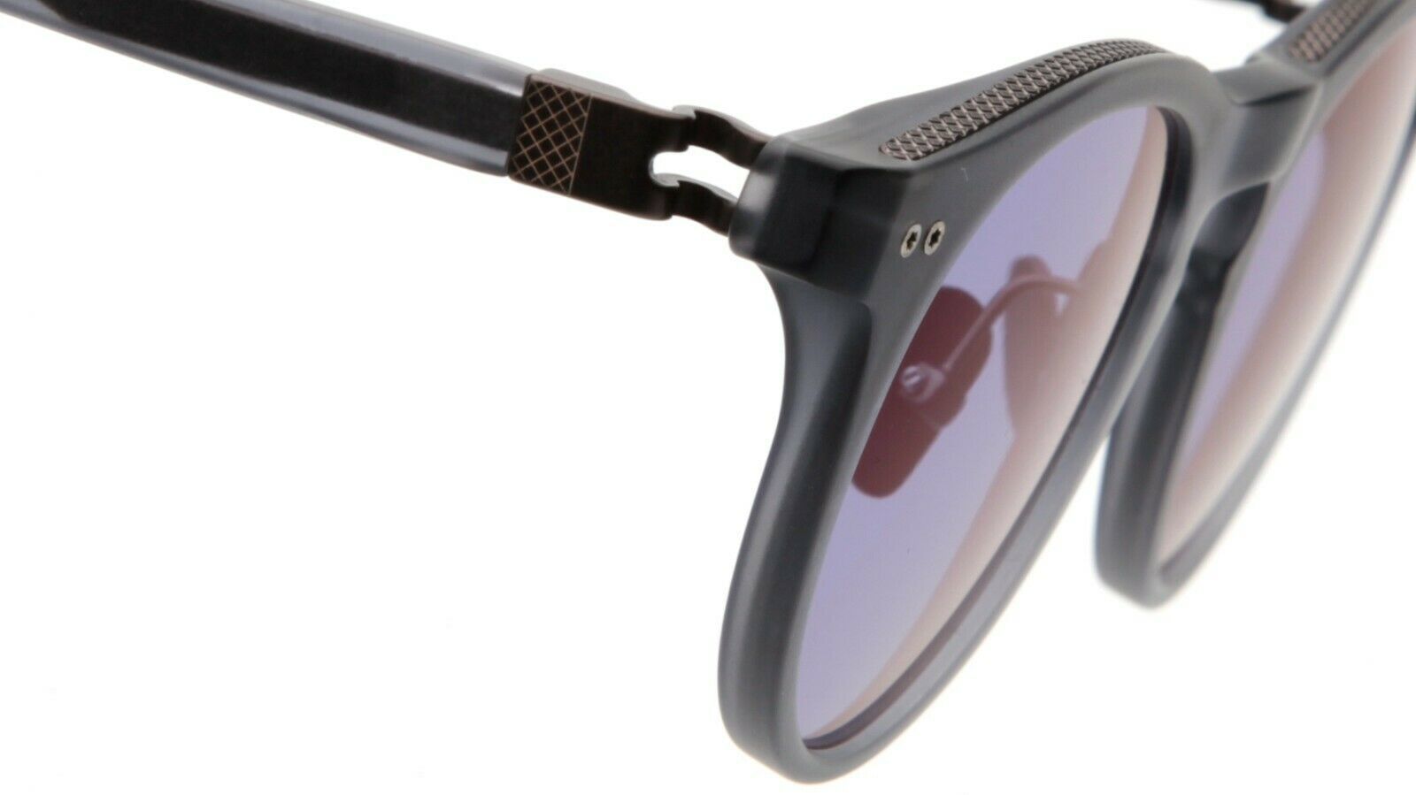 These super stylish sunglasses, by New York brand RVS Eyewear, feature a unique transparent grey acetate frame and blue tinted lenses. Meticulously hand crafted in Japan with the finest Japanese materials and signature matte finish. Unisex design. Dimensions: 48-21-140.