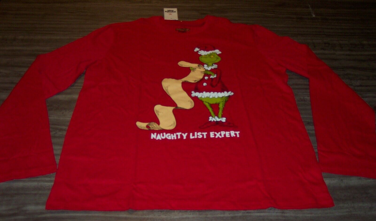 This is a Dr Seuss THE GRINCH WHO STOLE CHRISTMAS "Naughty List Expert" Long Sleeve T-shirt. It is a size LARGE and it is NEW w/ TAG. It is 22 1/2 inches from armpit to armpit and 30 inches in length. Combine auctions to save on shipping. D2AG
