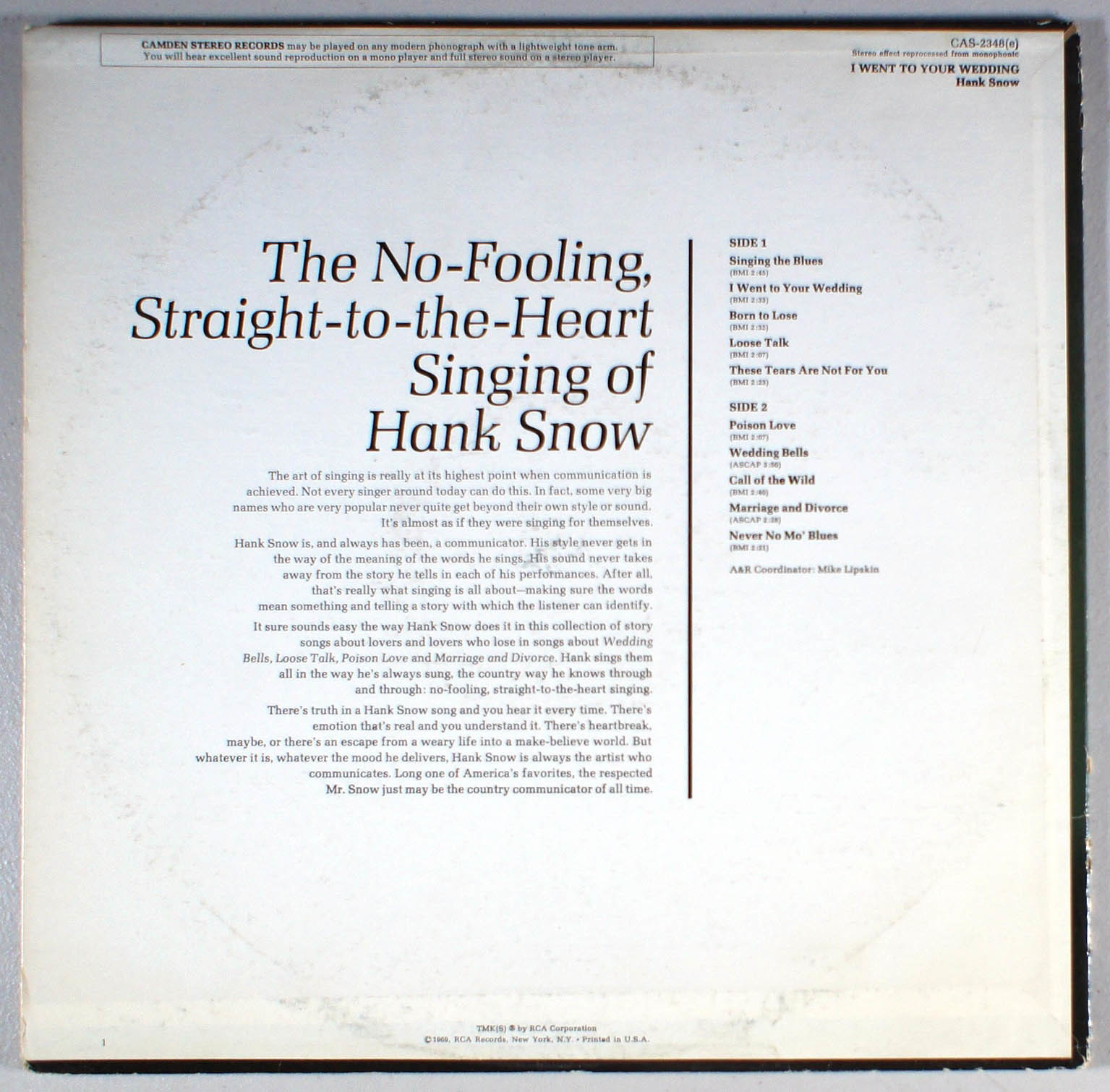 Hank Snow - I Went to Your Wedding (1969) Vinyl LP •PLAY-GRADED•