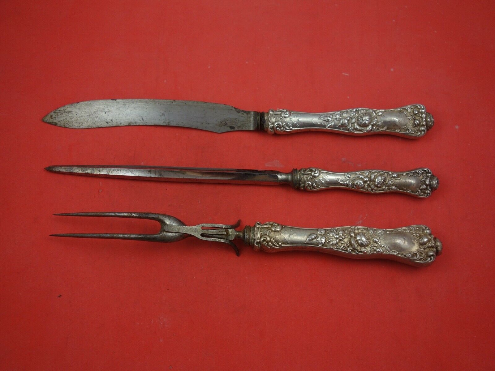 Sterling silver hollow handle with stainless Roast Carving Set 3-pc. Knife 13", Fork 12", Hone 13" in the pattern American Beauty by Shiebler. It is not monogrammed and is in as-is vintage condition, with some steel wear, as shown.