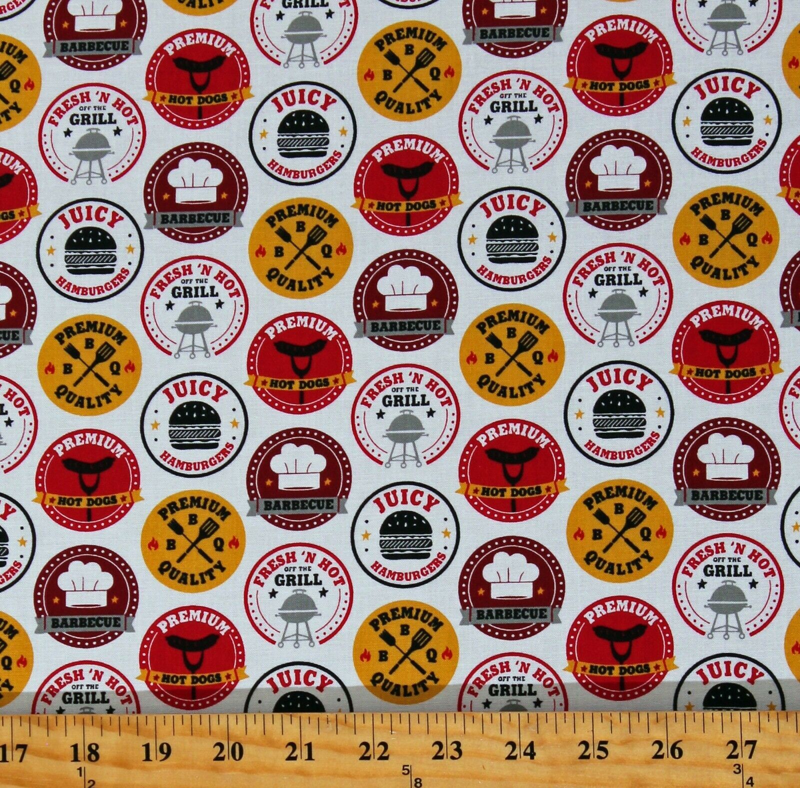Cotton BBQ Food Cooking Grilling Hotdogs Hamburgers Signs White Cotton Fabric Print by the Yard (9509-8)