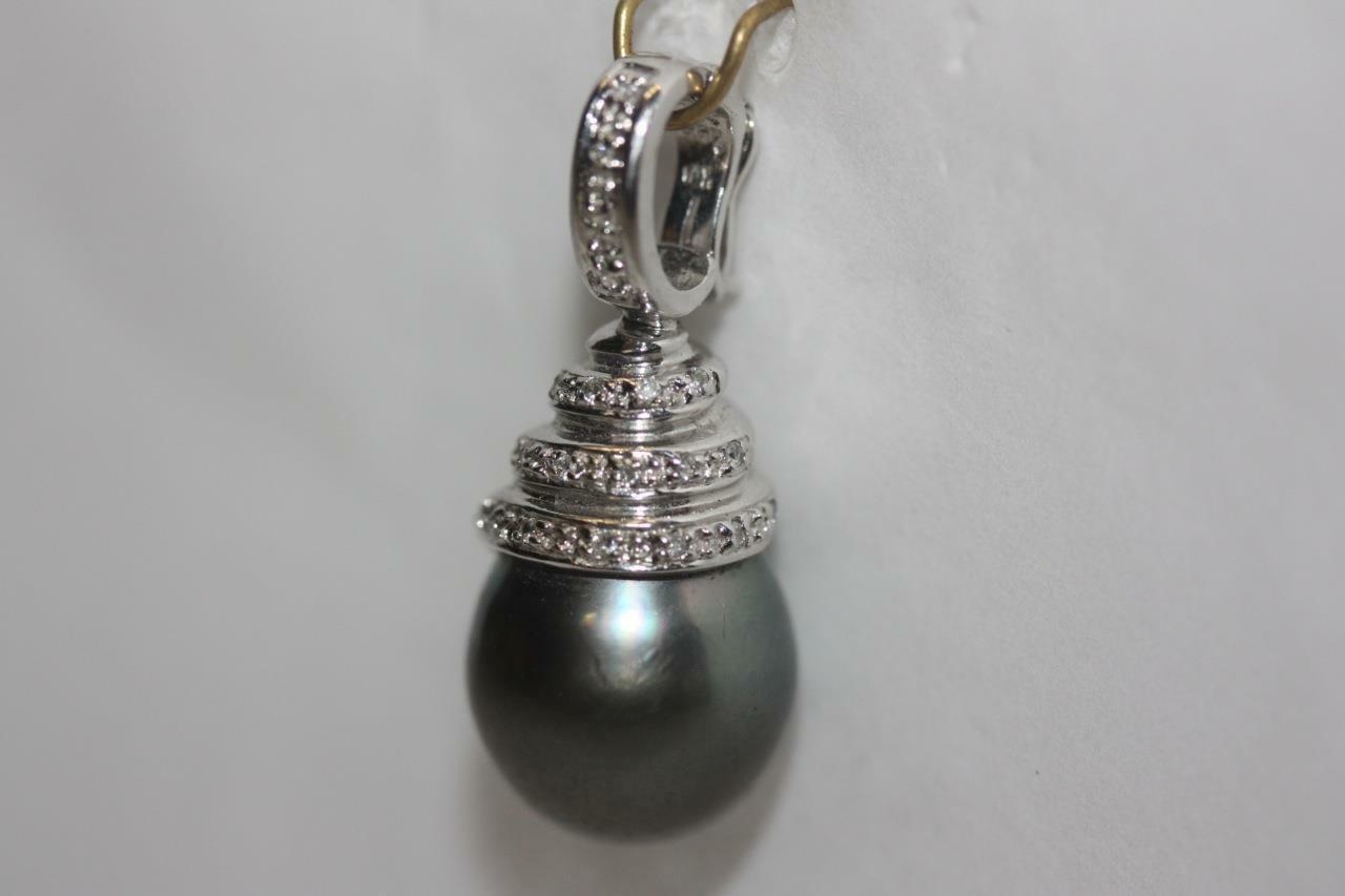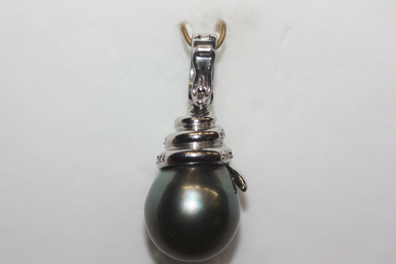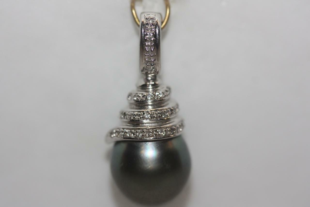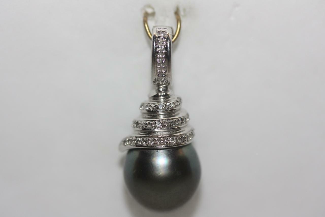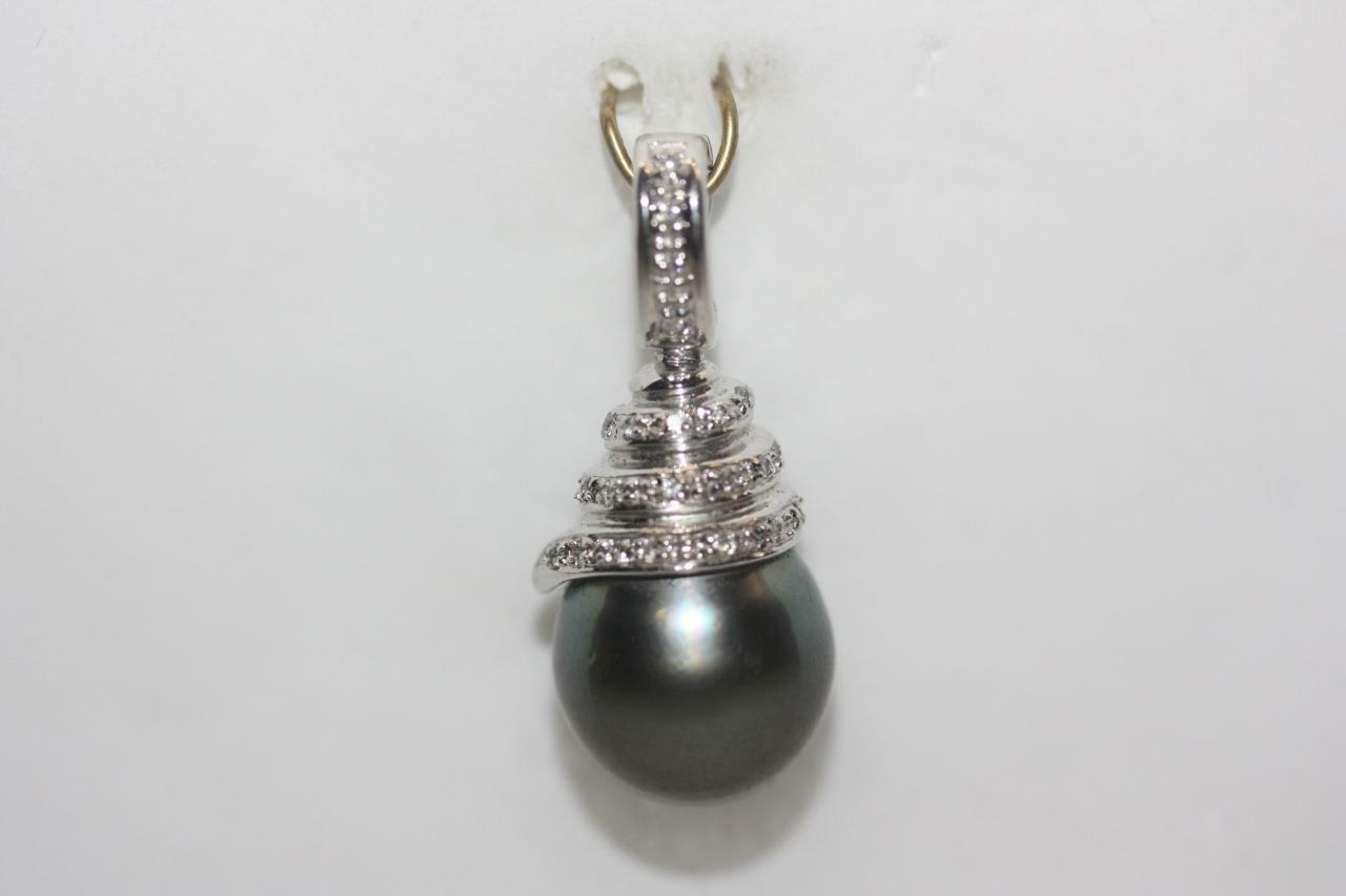 14K White Gold Pendant w/ Cultured Black Tahitian Pearl 11mm Diamonds Accents
