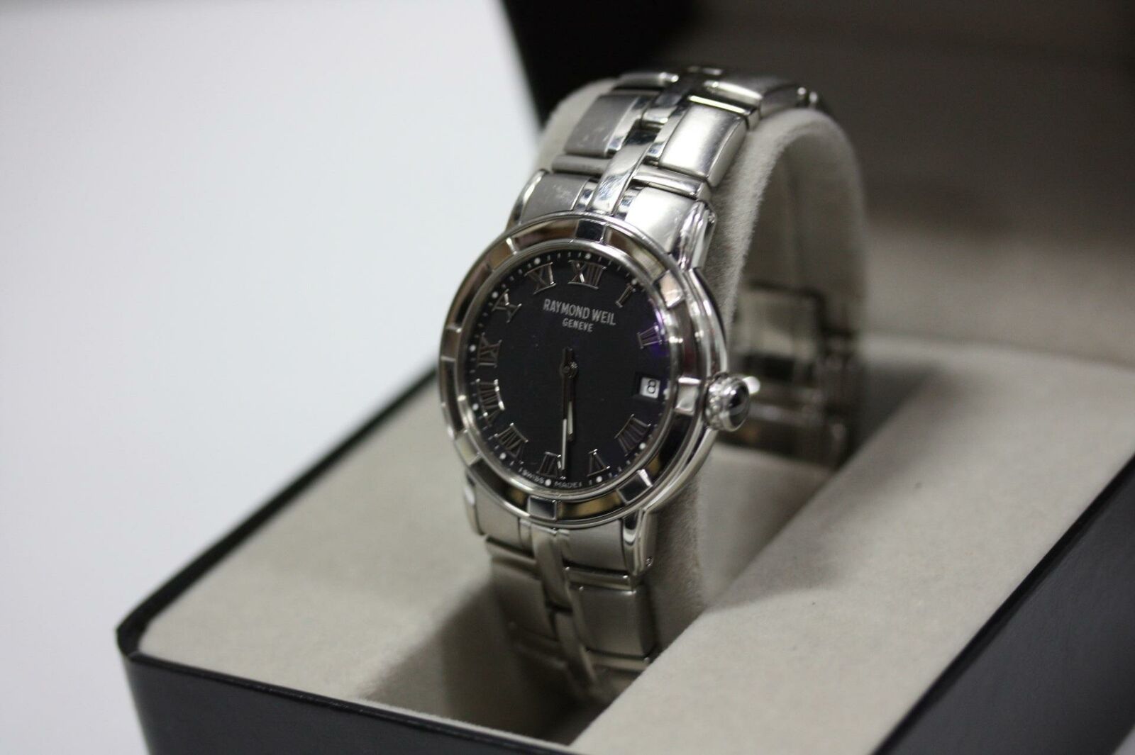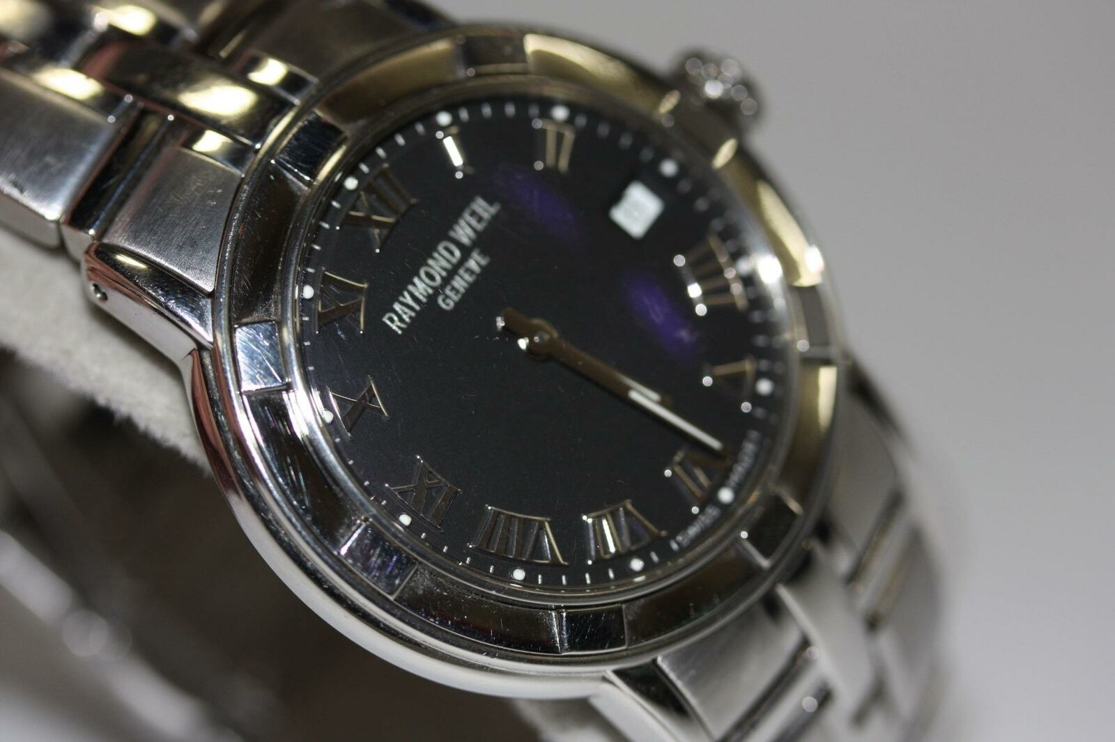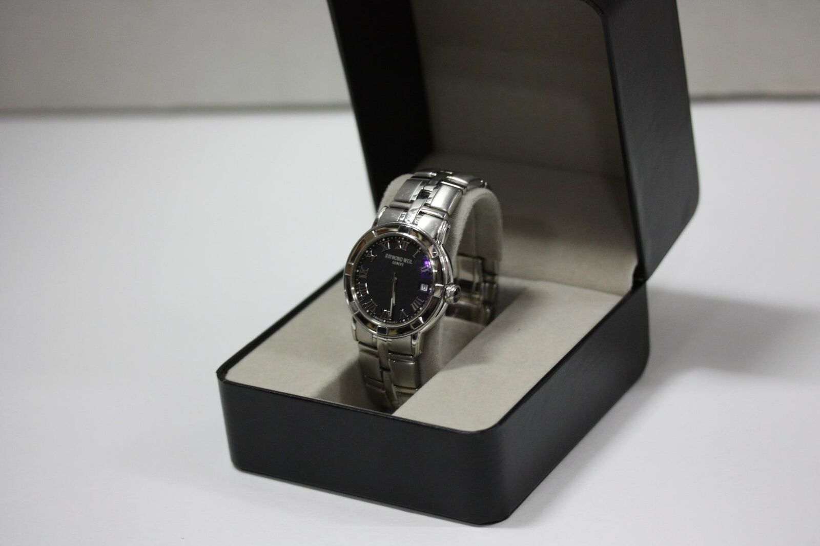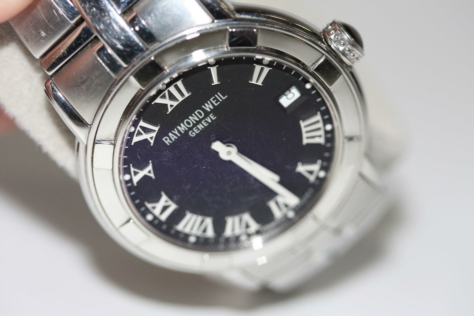 Offered for sale is an authentic Raymond Weil watch. From the Parsifal collection, a fine men's watch in very good pre-owned condition, displaying several signs of wear around the watch, such as light scratches. The crystal has small light scratches from normal use (Photo #3 shows scratches, it was taken with a macro lens). Case and bracelet have numerous scratches all over (please look at photos). The watch runs well and keeps perfect time. A fresh new battery has been installed. Watch comes exactly as shown in photos, original box is not included.