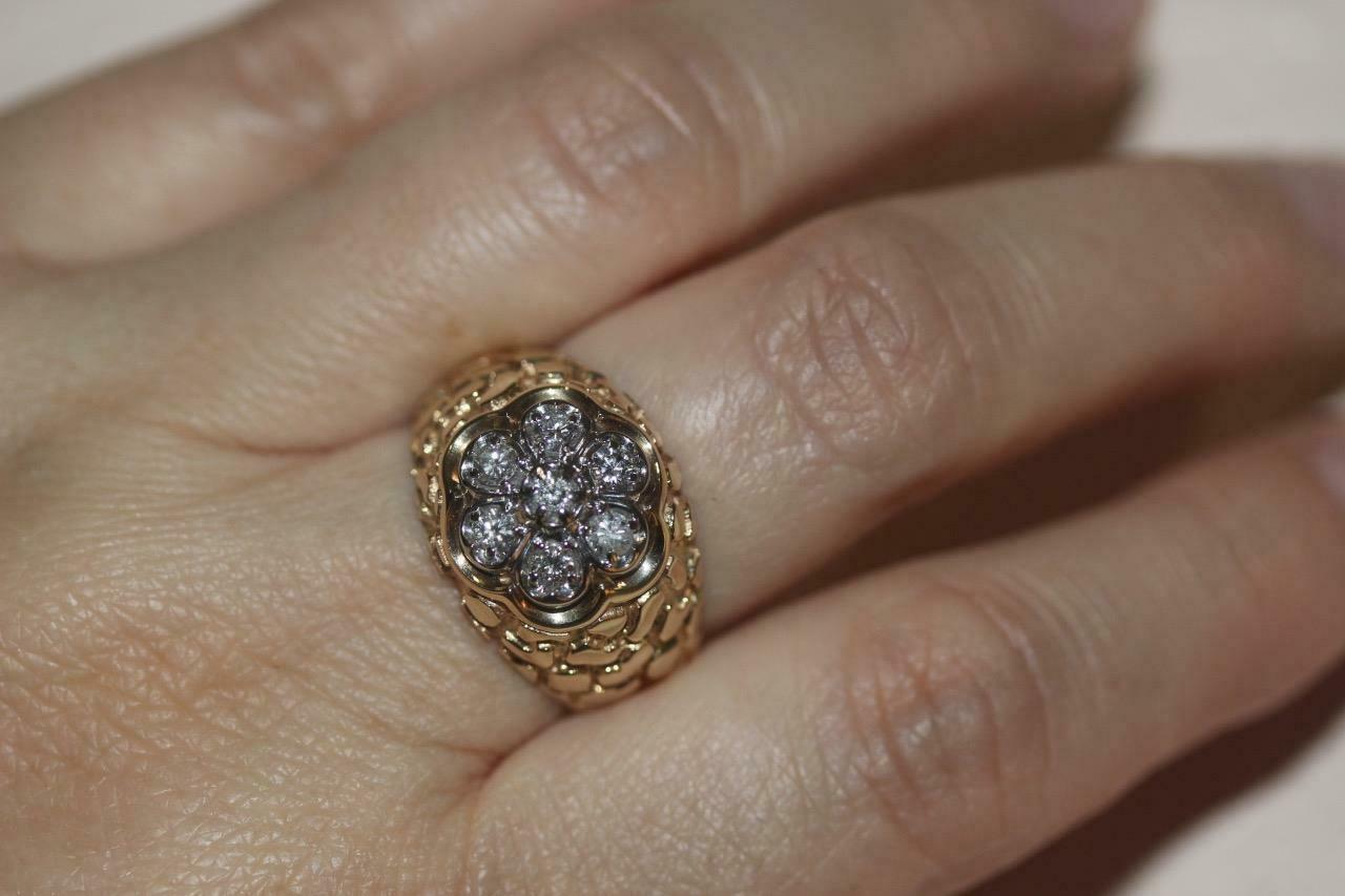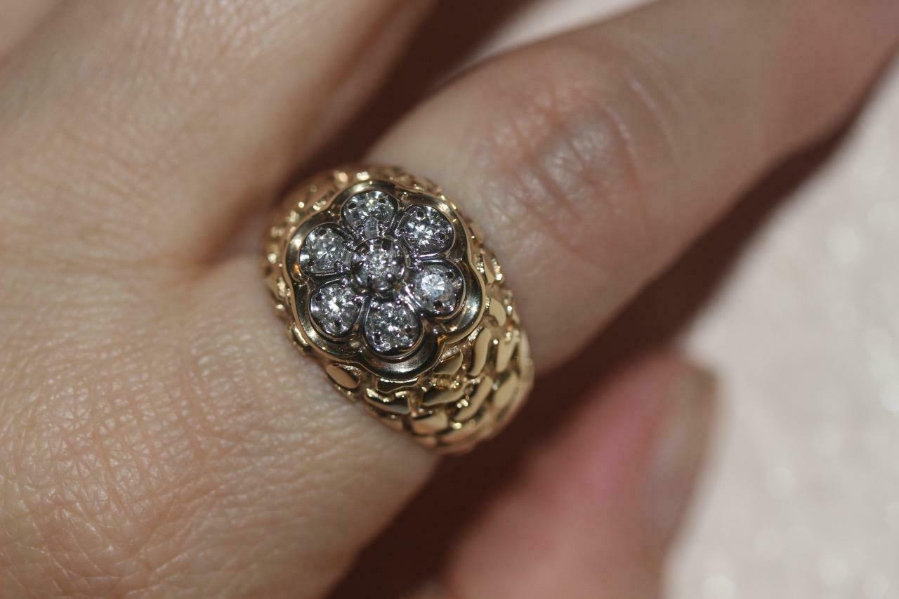 Offered for sale is a gorgeous 14k yellow Nugget ring with seven RBC diamonds. The ring is in very good pre-owned condition without visible flaws. Photos display item for sale.