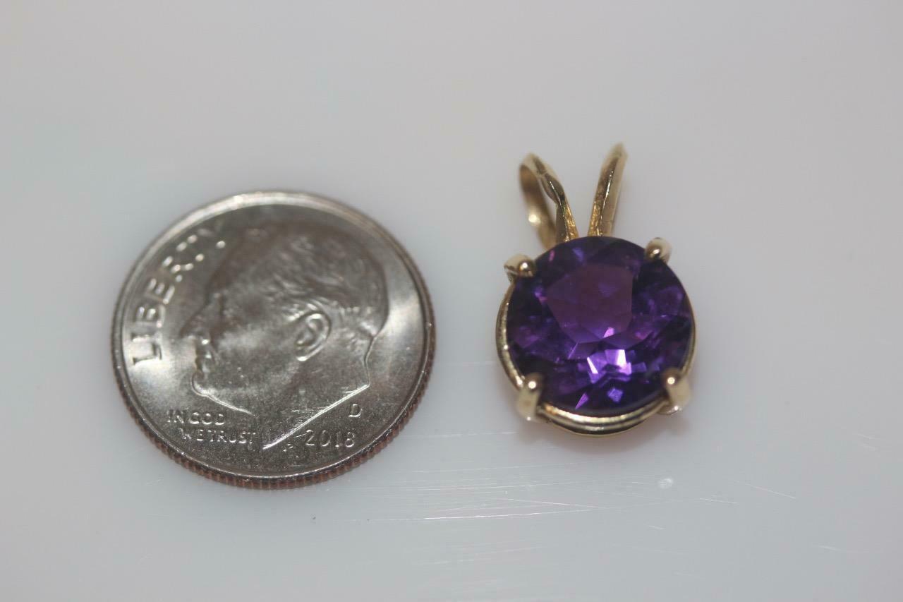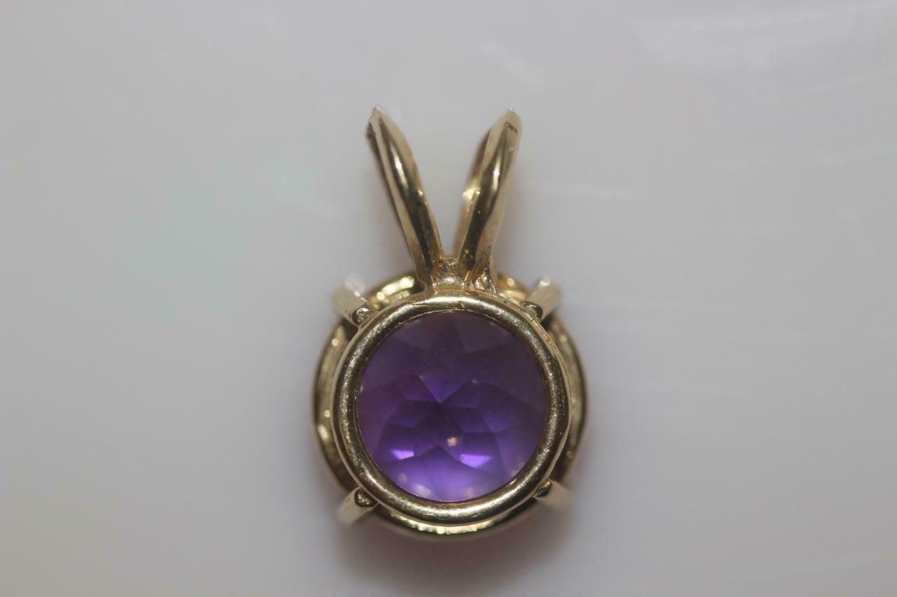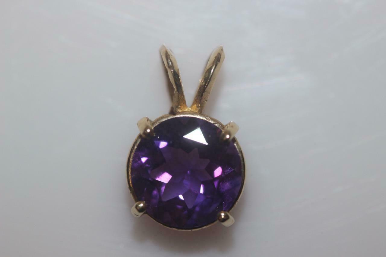 Offered for sale is a lovely round amethyst pendant, crafted in 14k yellow gold.