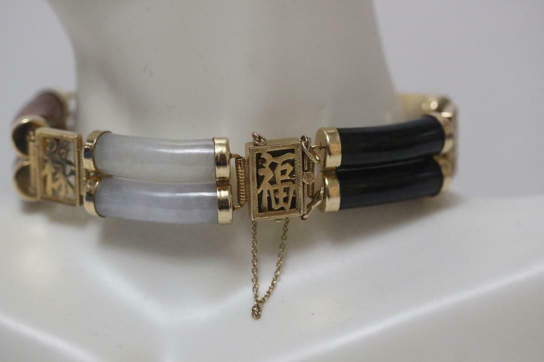 Vintage 14K Yellow Gold Chinese Good Luck Double Jade Bars Heavy Bracelet 45.0gr