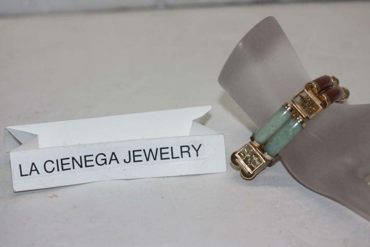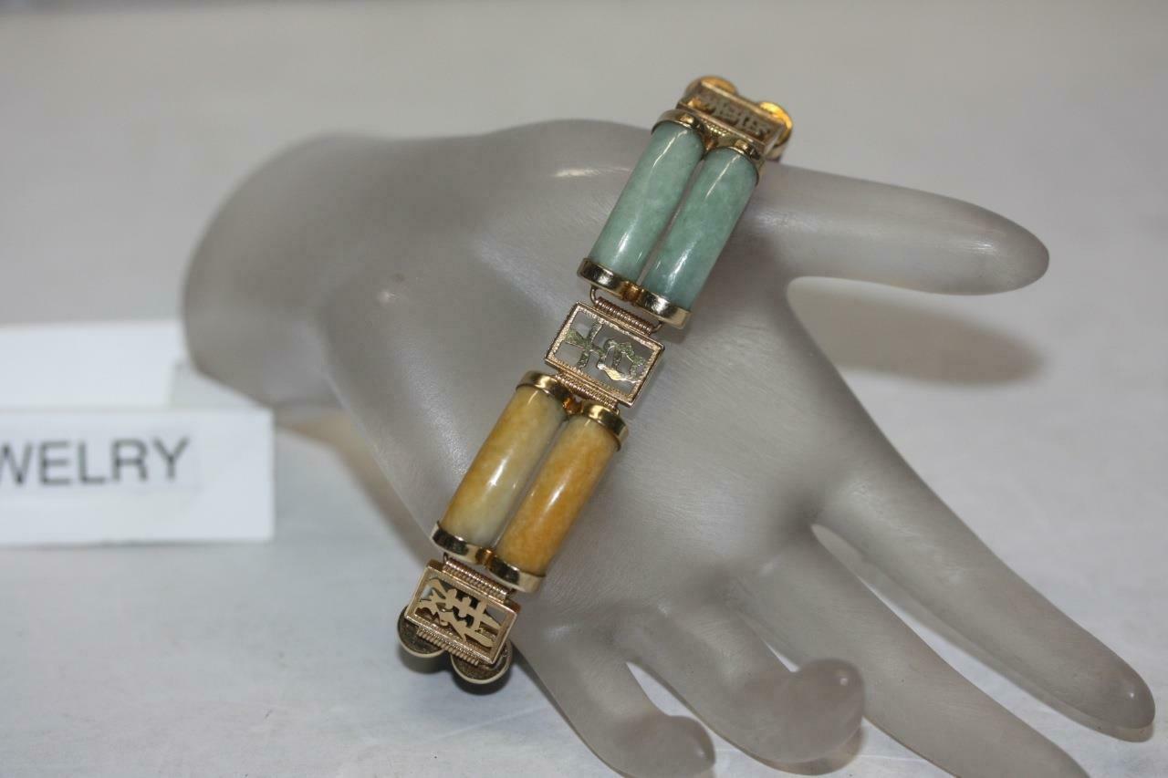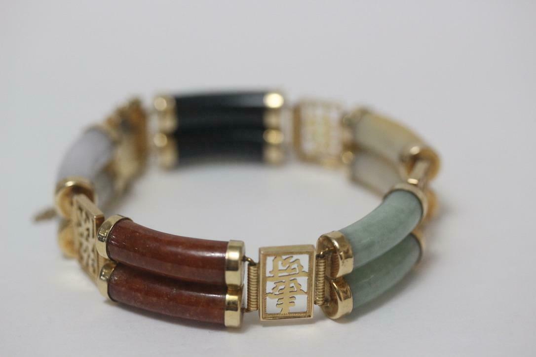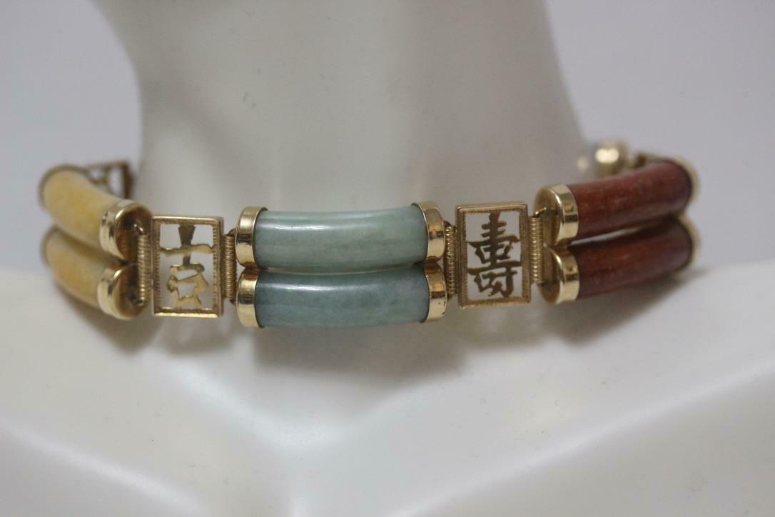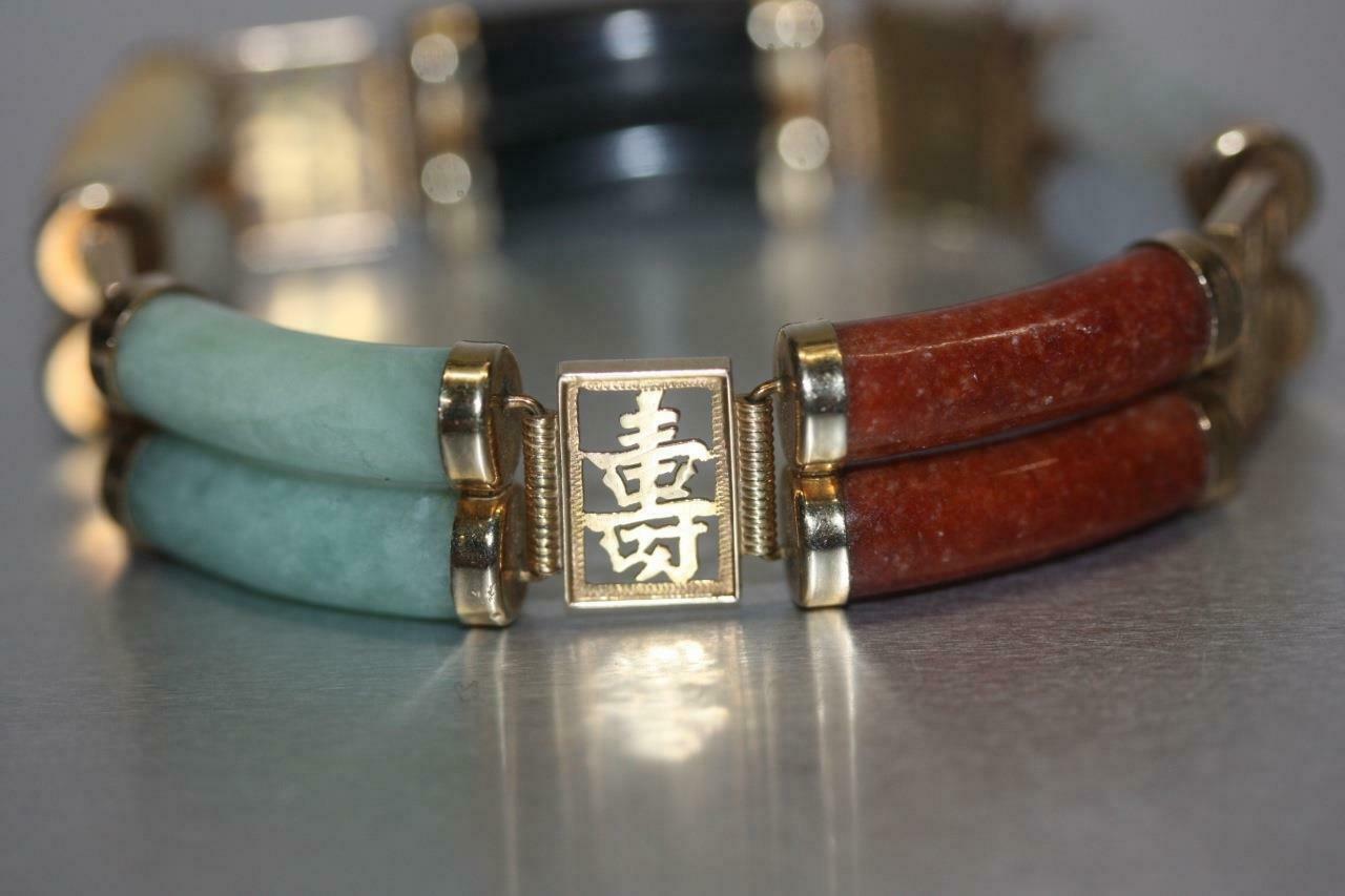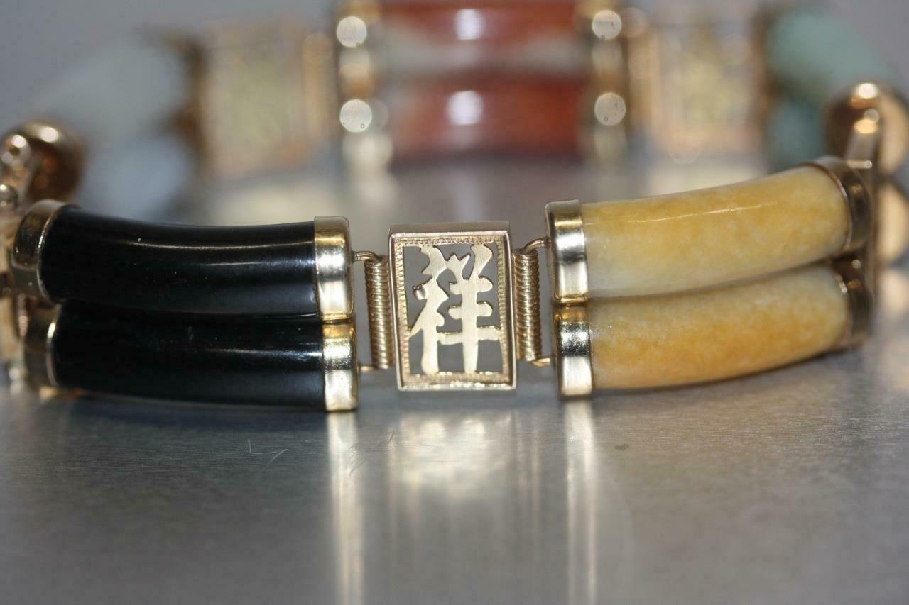 Offered for sale is a beautiful multi color Jade double bar bracelet with 14K yellow gold Chinese character links. This item is in very good condition as shown in photos. Please review all pictures for details.