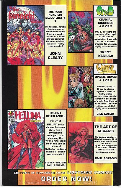 Description: Original cover price: $2.75. Regular cover by Paul Abrams. Written by Joseph Zyskowski. Art by Paul Abrams. Specially chosen by Lucifer himself to become a super-powered soldier of darkness, Hellina was purified by the power of Perg and transformed into a warrior against Hells forces on Earth. Hellina and Perg discover that demon-hearted Alexander Santili is the front for an alien invasion. 24 pages, B W. Mature readers. 121821-121821P