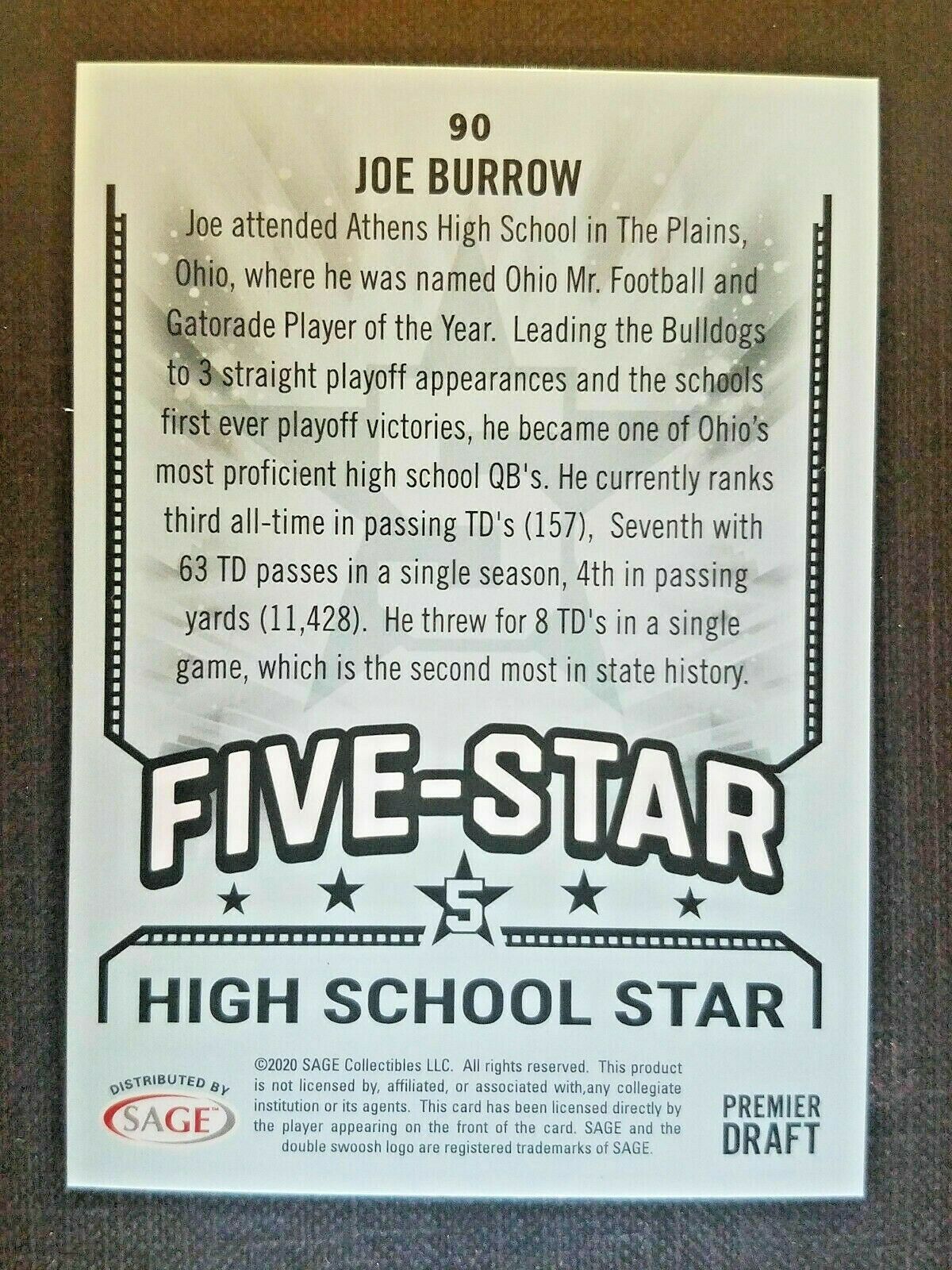 2020 Sage Hit Premiere Draft Joe Burrow Five-Star High School Star
