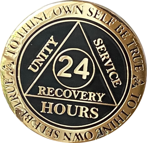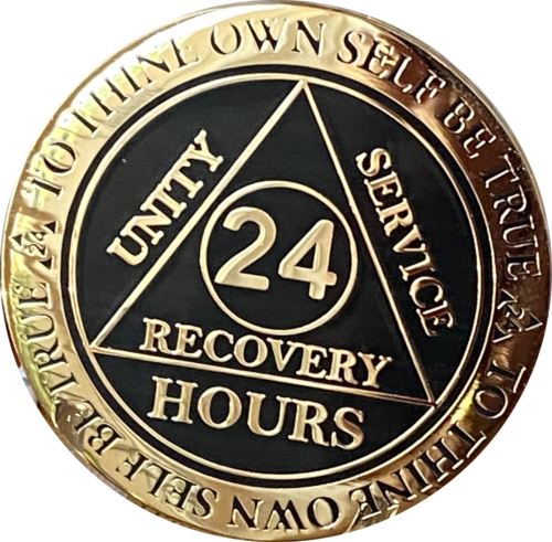 24 Hours AA Medallion Elegant Black Gold Plated Alcoholics Anonymous RecoveryChi