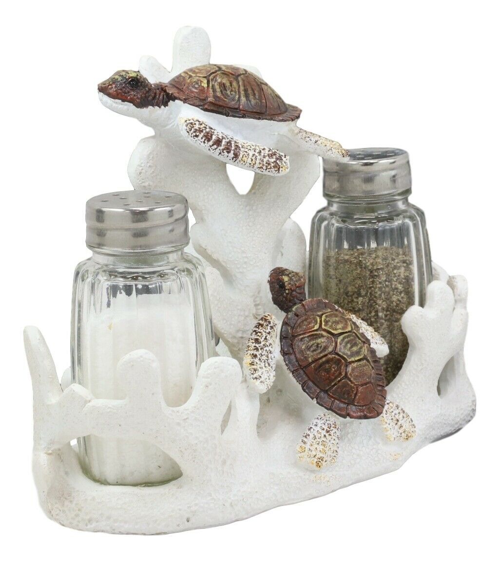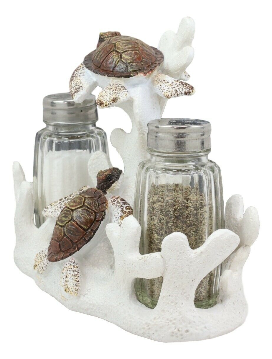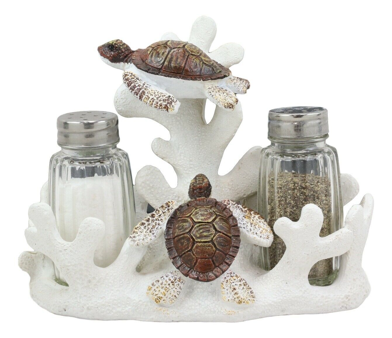This Sea Corals With Swimming Turtles Salt Pepper Shakers Holder Figurine is made of polyresin, hand painted and polished individually. Color Tone may vary from pictures. This listing comes with two glass shakers as pictured without the condiments.