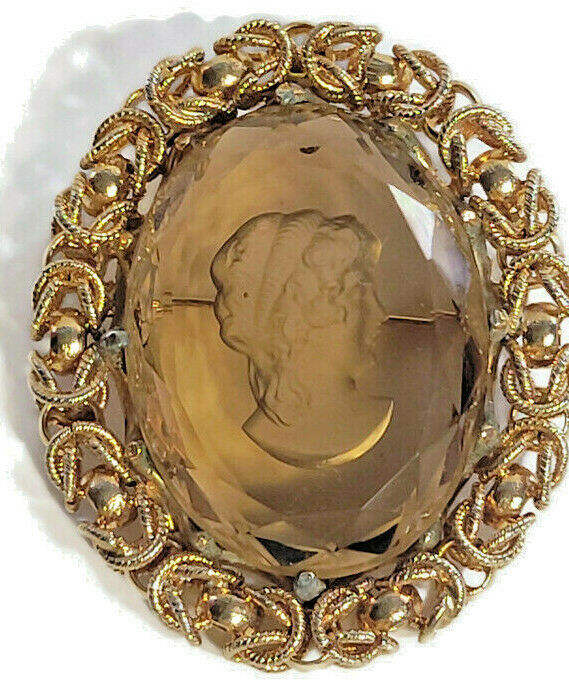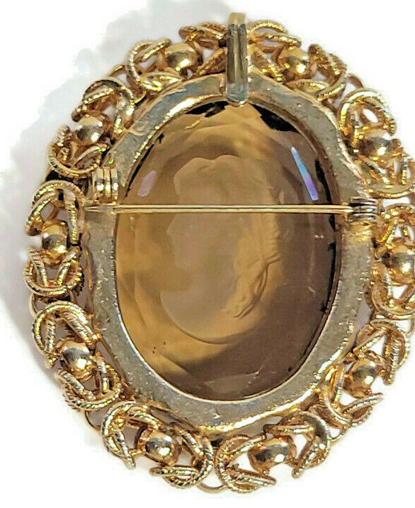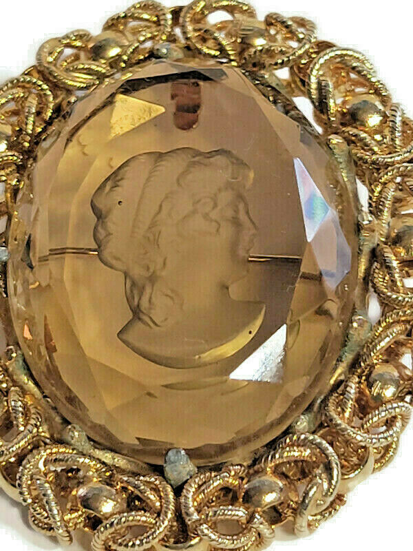 Unique See Through Thru Carved Cameo Brooch Pendant Gold-Tone Metal 2"