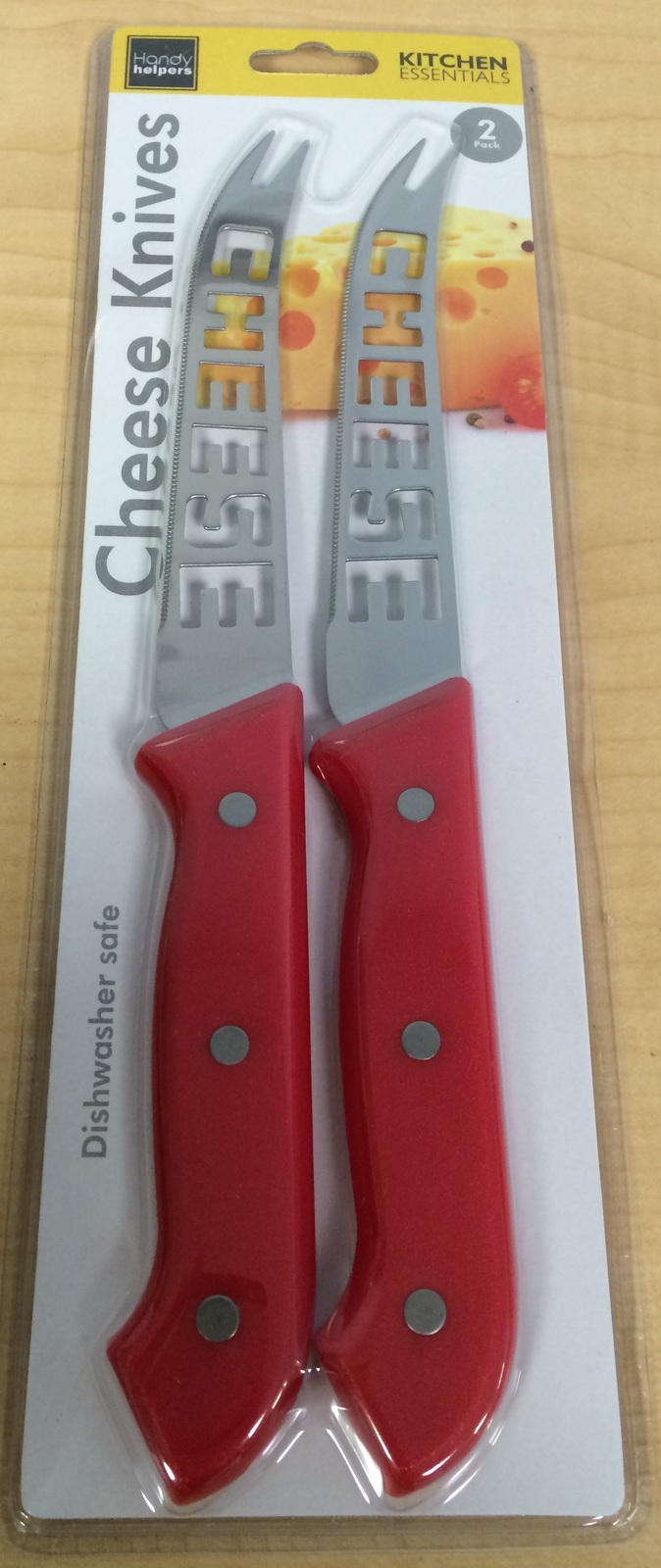 Slice cheese perfectly with this 2-pack set of cheese knives. Unique design features a cutout of the word cheese across the extremely sharp stainless steel blade for easy identification. Two prongs on the end of the knives allows them to be used for serving as well as cutting. Each knife measures approximately 10" long including handle. Dishwasher safe.