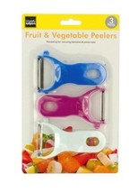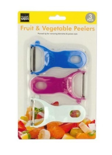 Easily peel fruits and vegetables and prepare potatoes with this 3-piece fruit and vegetable peelers set featuring compact peelers with sharp swiveling blades and curved plastic handles with scoops for removing potato eyes. Handles have hang holes for easy storage. Peelers measure approximately 4.25" long and 2.5" wide.