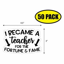 This listing is for a 50 pack of 4.5" x 3" 'I BECAME A TEACHER FOR THE FORTUNE FAME' decals.