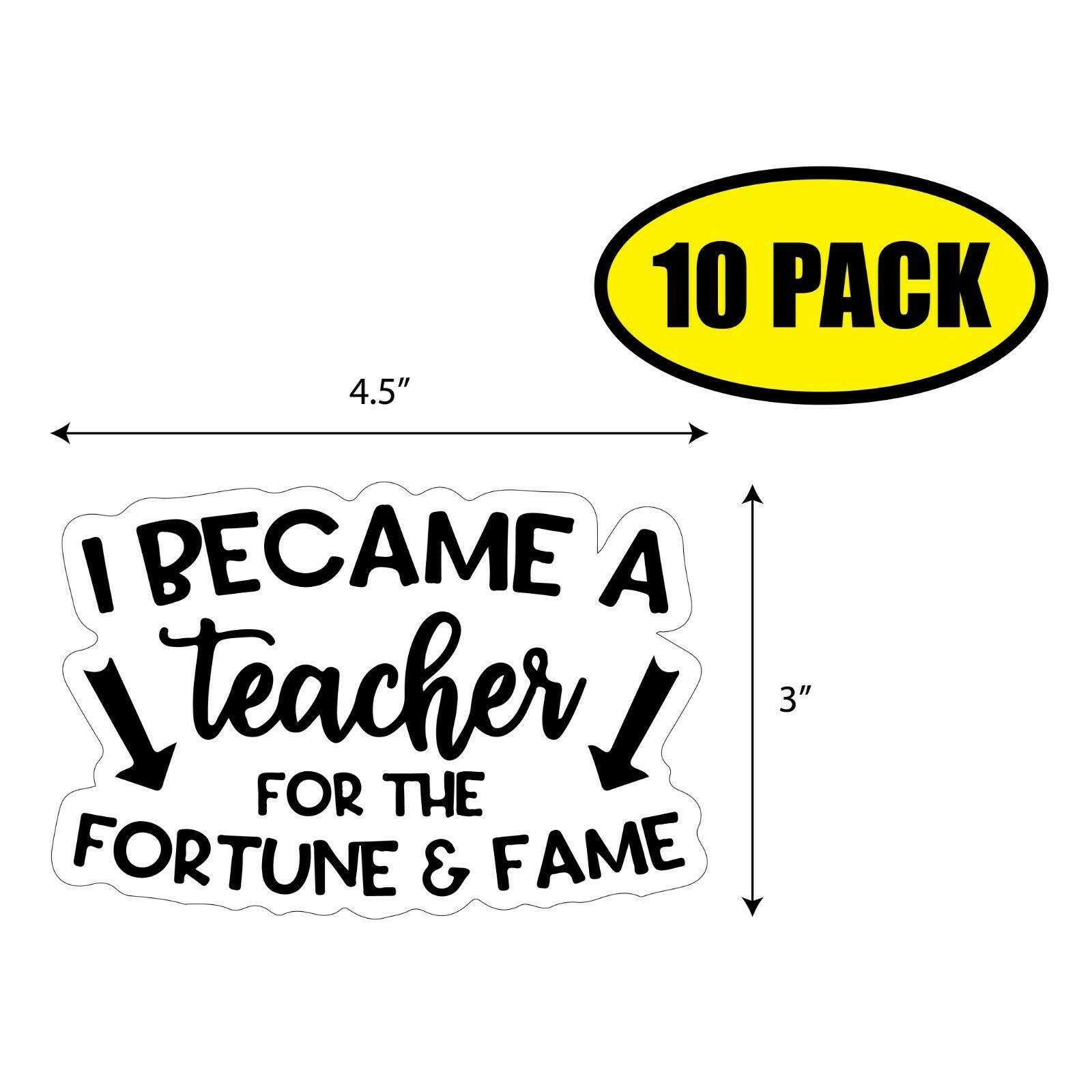 This listing is for a 10 pack of 4.5" x 3" 'I BECAME A TEACHER FOR THE FORTUNE FAME' decals.
