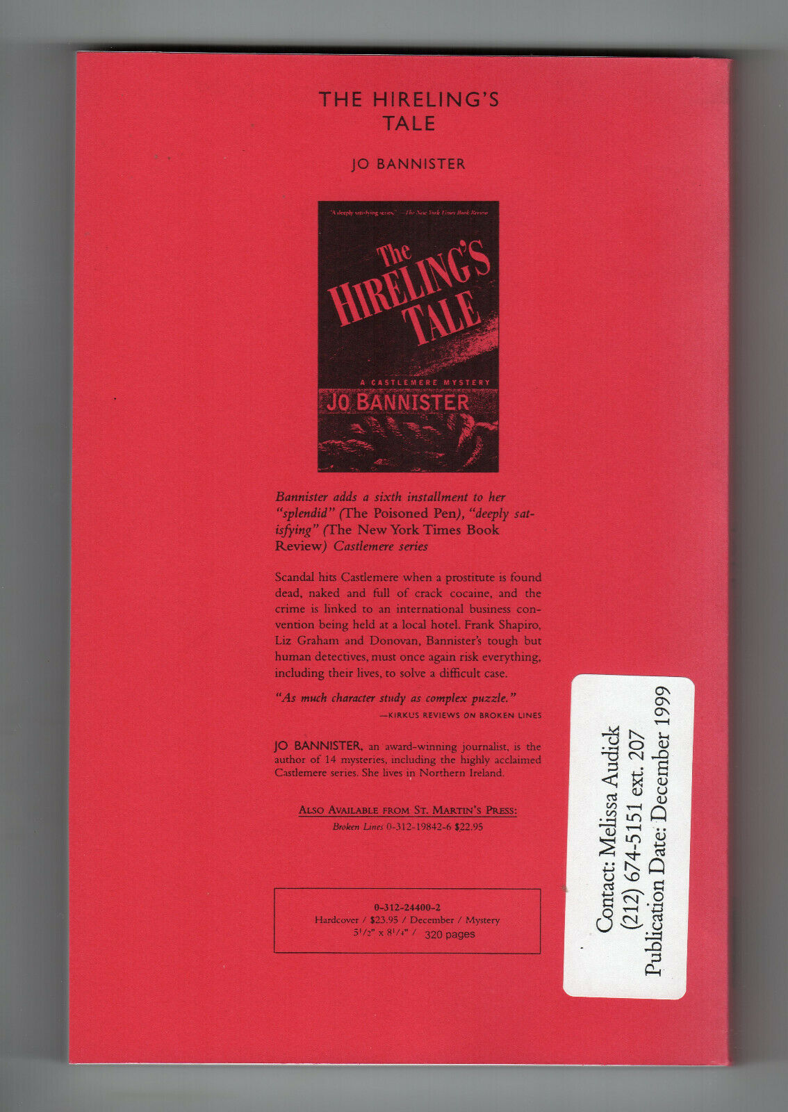Jo Bannister HIRELING'S TALE First edition Fine Advance Proof Mystery Detective