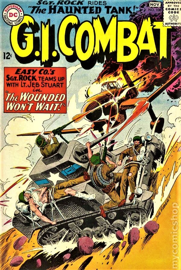Cover by Joe Kubert. Written by Robert Kanigher and Hank Chapman. Art by Joe Kubert and Jerry Grandenetti. Lt. Stuart is trying to get his three wounded crewmen to an army hospital when he is helped by Sgt. Rock and a couple of Easy Company soldiers. But they are also wounded. Tank commander and sergeant dodge more tanks to reach a field hospital, but it's under fire from an enemy advance in "The Wounded Won't Wait!" by Robert Kanigher and Joe Kubert. Starring the Haunted Tank, Jeb Stuart, Arch Asher, Rick Rawlins, Slim Stryker, General J.E.B. Stuart (ghost), Sgt. Rock and Easy Company [Ice Cream Soldier, Wild Man]. Plus: "Private War!" by Hank Chapman and Jerry Grandenetti. 36 Pages, Full Color. Cover price $0.12.