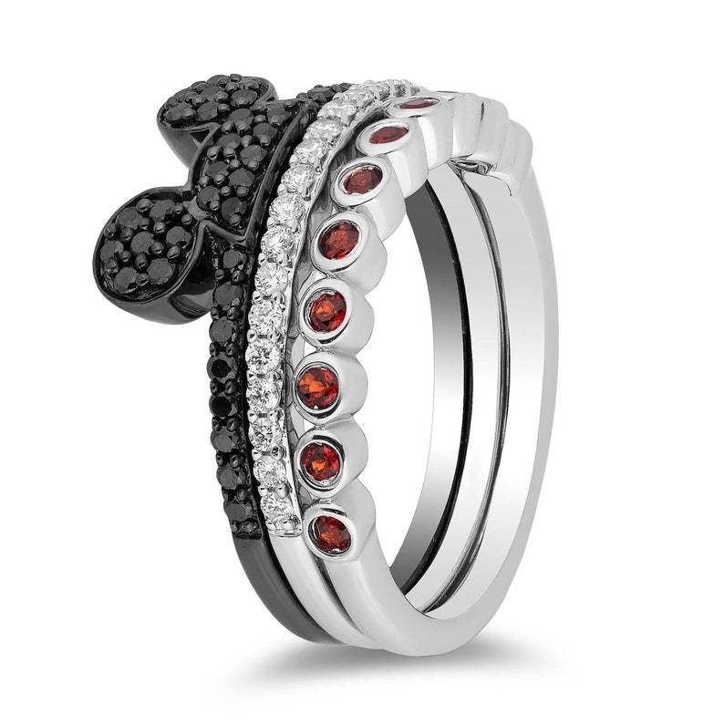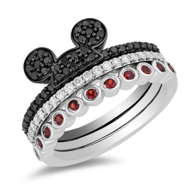 Mickey Mouse & Minnie Mouse Black Diamond & Garnet Diamond 3 Rings In 925 Silver