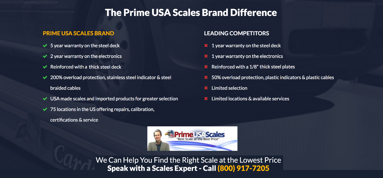 WHY BUY FROM US? We offer a quality built product at a reasonable price. We specialize in scales and nothing else. We offer sales, service, and calibration in the largest cities throughout the United States. We stand behind our products and have a knowledgeable staff ready to help with any questions. We manufacture American made products, build custom scales, and offer only the best quality.
