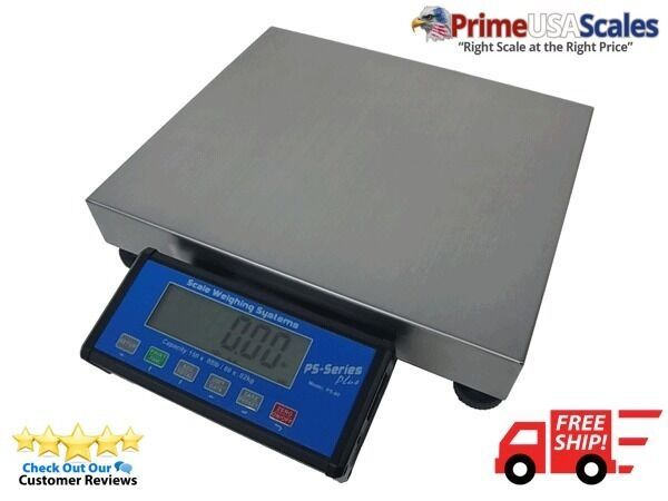 Prime USA Scales SWS-PS-60 Plus Shipping Scale is the perfect solution for all of your shipping and weighing needs. The PS-60 Plus is Legal for Trade or Not Legal for Trade and has an Industrial Heavy Duty Cast Aluminum Base with a Stainless Steel Platter and connected to the Large Blue Back-Lit LCD Display that is made of a Heavy Duty Aluminum Alloy. No Plastic Here! The SWS-PS-60 Plus is also AC/DC making it completely portable using (4) AA Batteries. The PS-60 Plus is Compatible with software from UPS, Fedex, and others as well as POS. Serial and USB Ports are standard and the cables for each are included as well. Model #65279;SWS-PS-60 Plus Max Capacity 150 lb Readability 0.05lb (0.02kg) Display Resolution 1:3000 Construction Die-cast aluminum base, stainless steel platform Weighing Units lb / kg / lb:oz Calibration unit lb Application Modes Weighing / Counting / Check weighing Display 6-digit, 7-segment, 1" (25mm) LCD with blue backlight Zero Range Programmable zero range Tare Range Full capacity Stabilization Time lt;3 seconds Operating Temperature 15 deg; to 105 deg;F (-10 deg; to 40 deg;C) Humidity Range lt;90% relative humidity, non-condensing Power Supply Alkaline Batteries: 4 x ldquo;AA rdquo; size cells AC Adapter: 6Vdc/500mA, with central positive USB Interface RS232 (COM1) and USB (COM2) Feet 4 x fixed bolt design, adjustable height Safe Max Overload 150% of capacity Platform Dimensions (L x W x H) 14" x 12" x 3" (355x305x76mm) We strive for 100% Feedback! WHY BUY FROM US? We offer a quality built product at a reasonable price. We specialize in scales and nothing else. We offer sales, service, and calibration in the largest cities throughout the United States. We stand behind our products and have a knowledgeable staff ready to help with any questions. We manufacture American made products, build custom scales, and offer only the best quality. #65279;