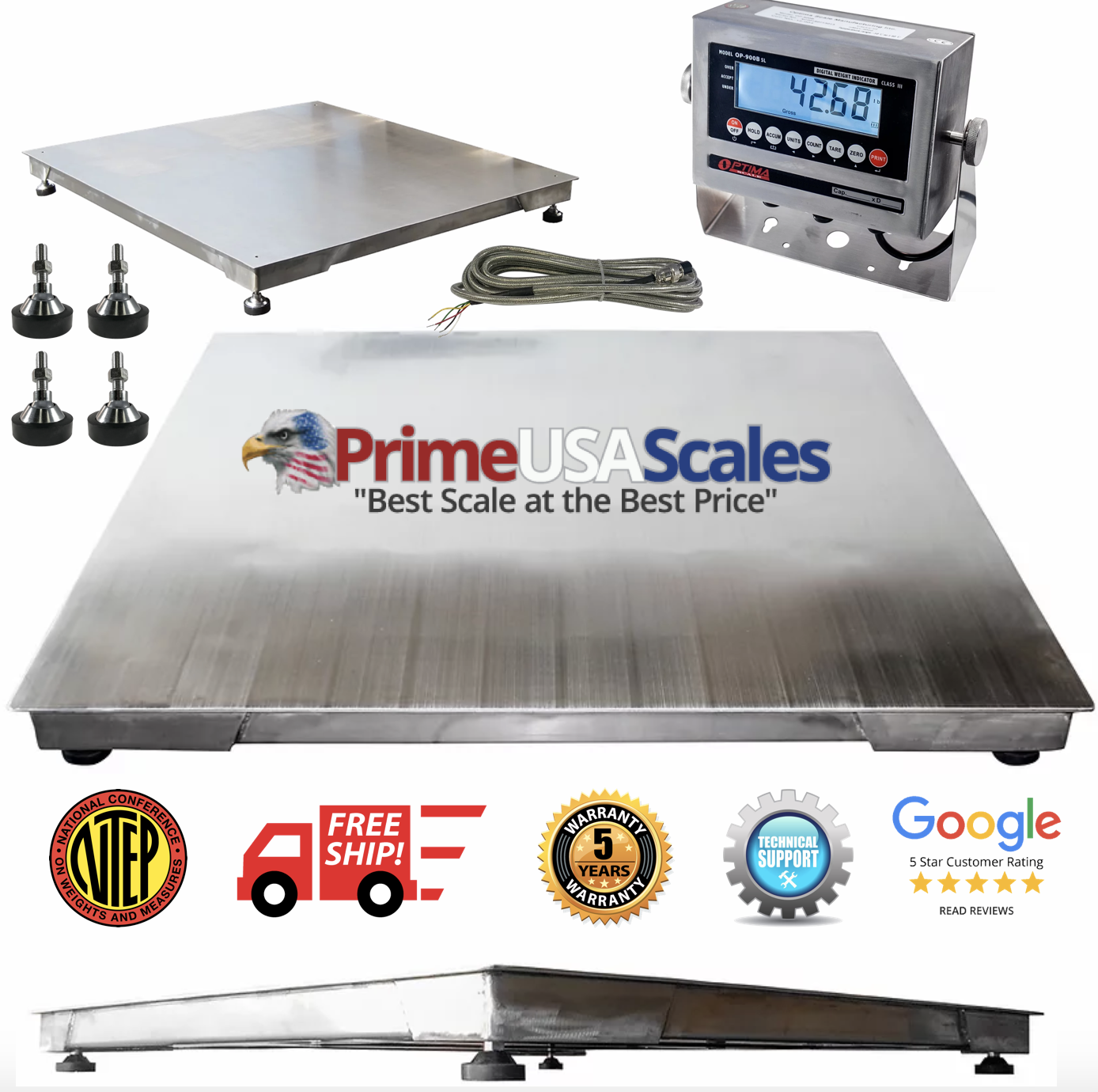 Prime USA Scales OP-916SS stainless steel floor scale. This fixed top model features an easy wash down scale for cleaning and outdoor applications. The scale comes in a platform size of 3 rsquo;x3 prime; and has a 5,000 lb capacity. This scale is NTEP approved (Legal for trade). The OP-916SS model is manufactured with 304 graded stainless steel to prevent rust. This system is complete with a stainless steel indicator in LCD rechargeable battery and comes calibrated. Included is a 5 year warranty on the steel frame and 2 years on electronics. FEATURES: ---High quality platform scale for industrial use ---Made from all stainless steel and can be sprayed down ---200% overload protection ---20 rsquo; long heavy duty metal shielded cable for indicator ---Includes OP-900 NTEP indicator with a 6 digit, 1 rdquo; display ---Indicator is lb/kg selectable, with a rechargable battery ---Built-in RS-232 communication port ---Factory Calibrated Indicator Features: ---OP-900B SL NTEP indicator with LCD display ---1 Prime; Tall backlit display ---Optional Rechargeable battery (up to 100 hrs) ---Stainless steel washdown NEMA 4X casing ---AC adapter included ---Weighing units: (LED:kg/lb) ( LCD:lb/kg/g/oz/lb:oz) ---Gross/Tare/Pre-Set Tare/Zero ---Multiple Hold functions ---Count weighing ---Accumulation weighing ---Overload / Underload alarm ---Splash proof keyboard and display ---Connects to a remote display and printer ---NTEP approved for 5,000 divisions ---Displays up to 50,000 graduations ---Full Duplex RS-232 Serial Port WHY BUY FROM US? Prime USA Scales is an American owned and operated business. We have been in the weighing industry for over 20 years. Our family owned business has three generations in the scale industry. We offer a quality built product at a reasonable price. We specialize in scales, scale service, and calibration. We stock all parts: load cells, digital displays, junction box, cables, and more. On top of that we offer sales, service, and calibration in the largest cities throughout the US. We stand behind our products and have a knowledgeable staff ready to help with any questions.