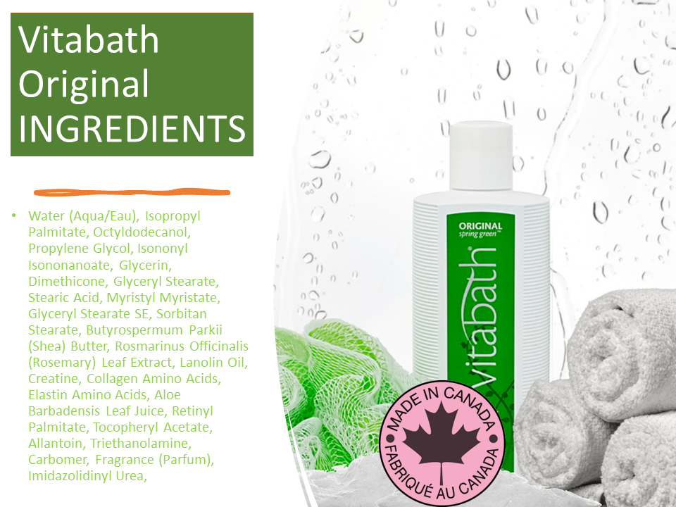 Size of 1 Vitabath Original Spring Green Lotion is 10 fl oz; Made in Canada