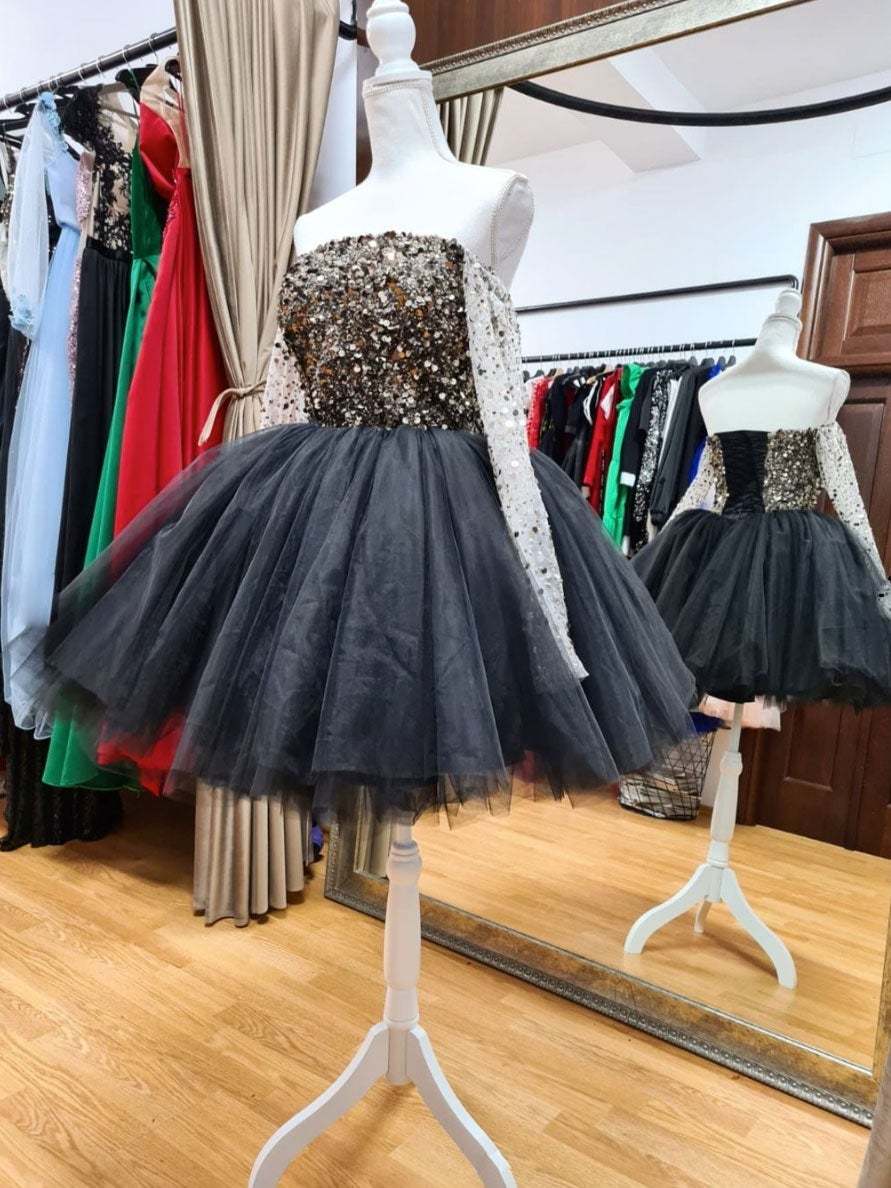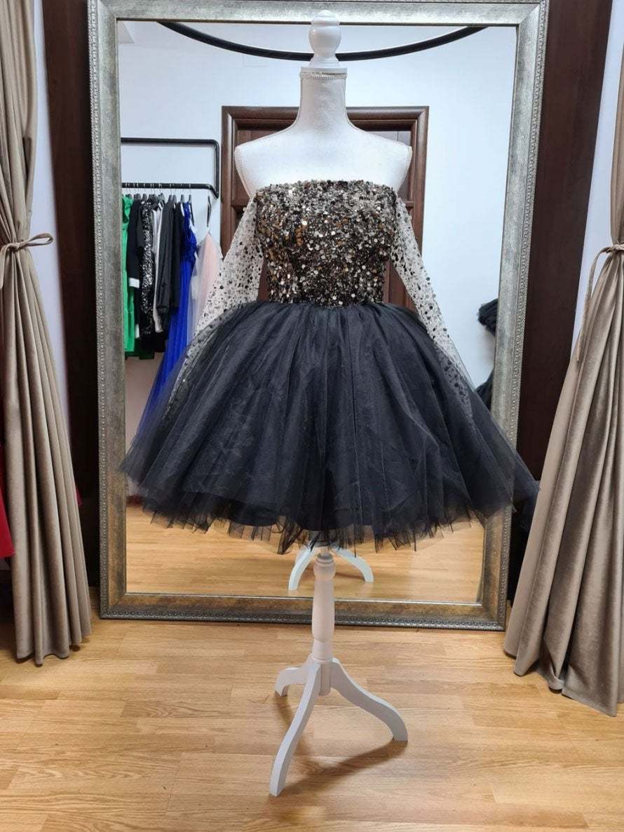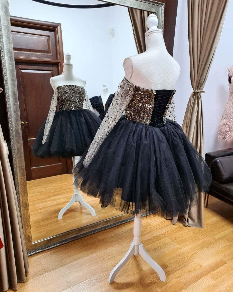 Black tulle sequin short prom dress, black homecoming dress
