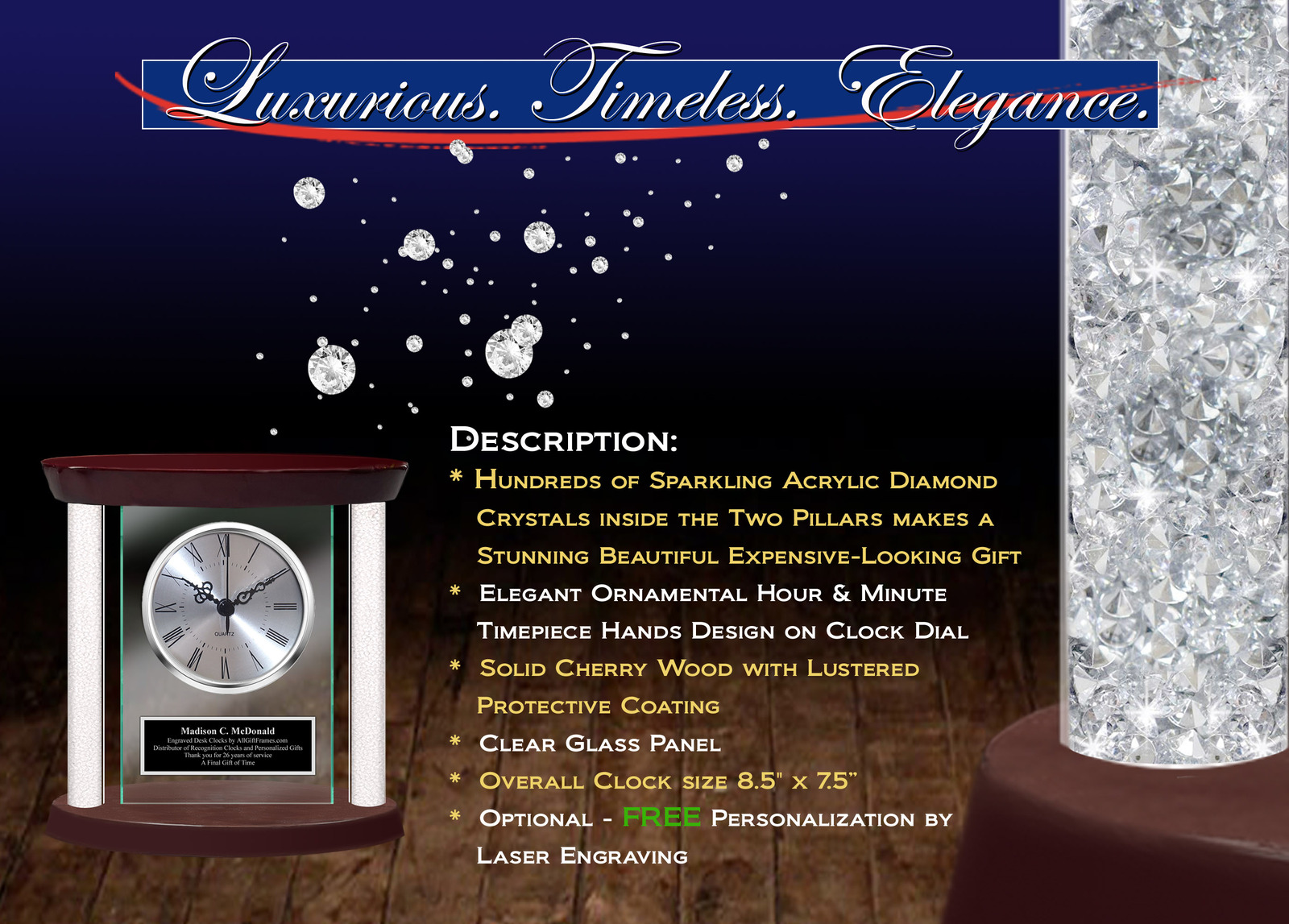 The Showstopper Diamond Bliss Desk Clock features a wooden oval style design with silver dial clock mounted in glass, while the deluxe quartz clock dial has elegant roman numerals with ornamental hour and minute time movement needle on silver display face. Hundreds of gleaming acrylic diamond crystals are filled inside the double columns makes an impressive alluring personalized gift. Embrace the extraordinary craftsmanship timeless appeal of this dramatic personalized desk clock. The etched clock truly succeeds as recognition, appreciation, birthday, romantic or retirement gift desk clock with outstanding design. Striving to be the best leads to success and working at a company for many years deserves a gift that has an outstanding design with useful functionality. The highlights of this charming and elegant accent desk decor for the home or office reflects years of service and recognition when given as a employee service award. This grand and impressive desk clock is an exquisite timepiece that will make a unique retirement, promotion or simply a wedding anniversary gift. Add a touch of sentimental value by with a black personalized engraving plate to signify success. Brilliant in shine. Opulence in style, this engraved clock features the hundreds acrylic crystals in the double column giving sparkling shine to a glistening display containing a silver table clock. Congratulations Engagement Graduation Valentines Day Thank You Appreciation New Home Housewarming Corporate Promotion Going Away Wedding Anniversary Birthday