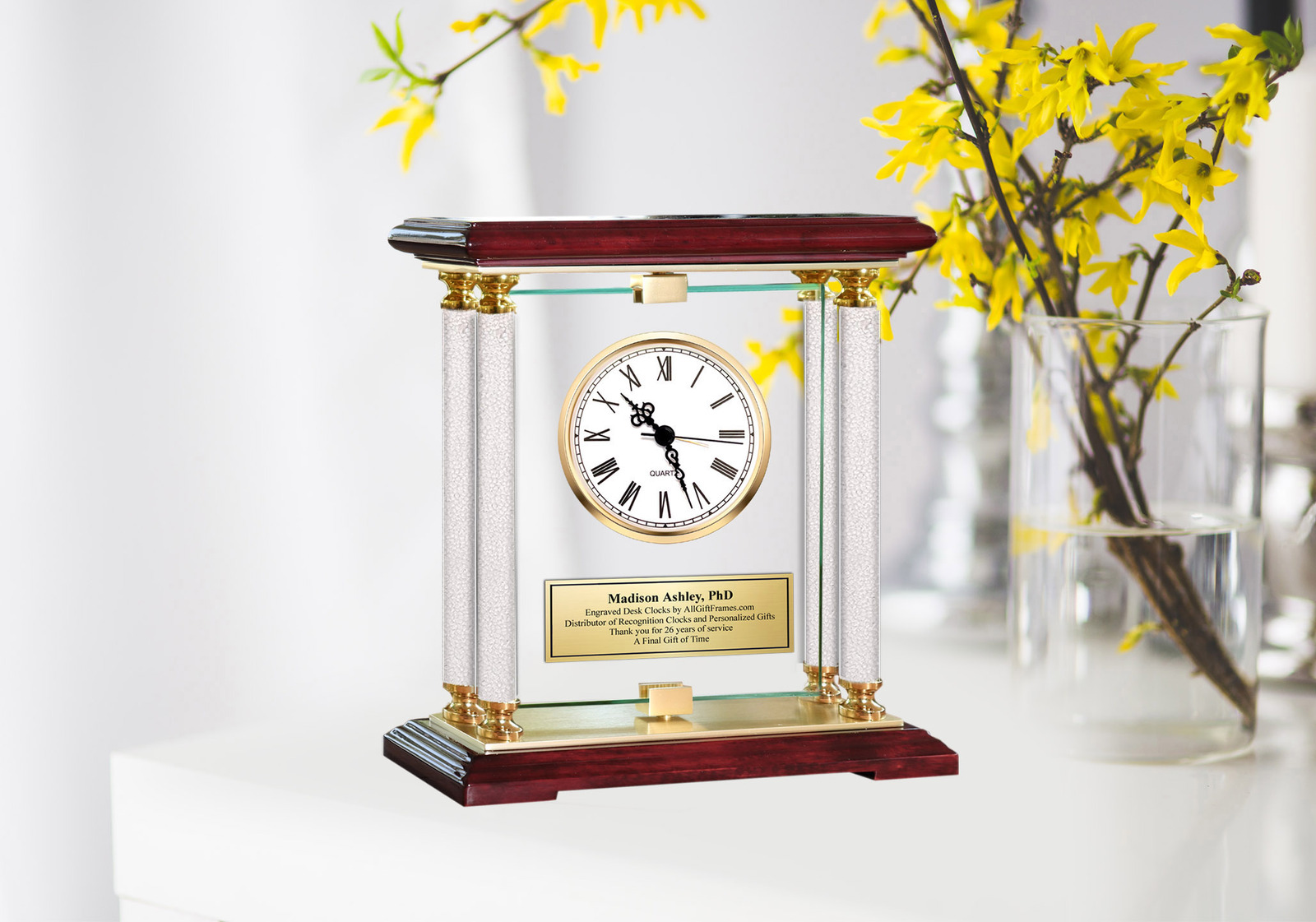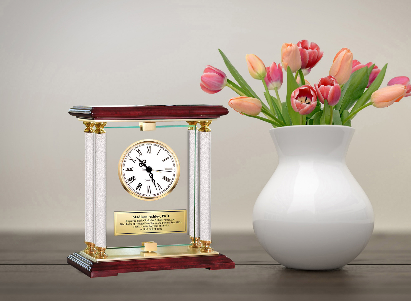 The sophisticated diamond designer styling of the desk tabletop clock creates a lovely gift of distinction for a graduate, retiree, employee recognition or any special occasion. A unique personalized gift idea for coworker, employee, boss, girlfriend, boyfriend, wife, husband, etc.. Personalized Clock Diamond Column Engraving Business Gift Engravable Etched Custom Executive Service Award Gift Retirement Employee Present